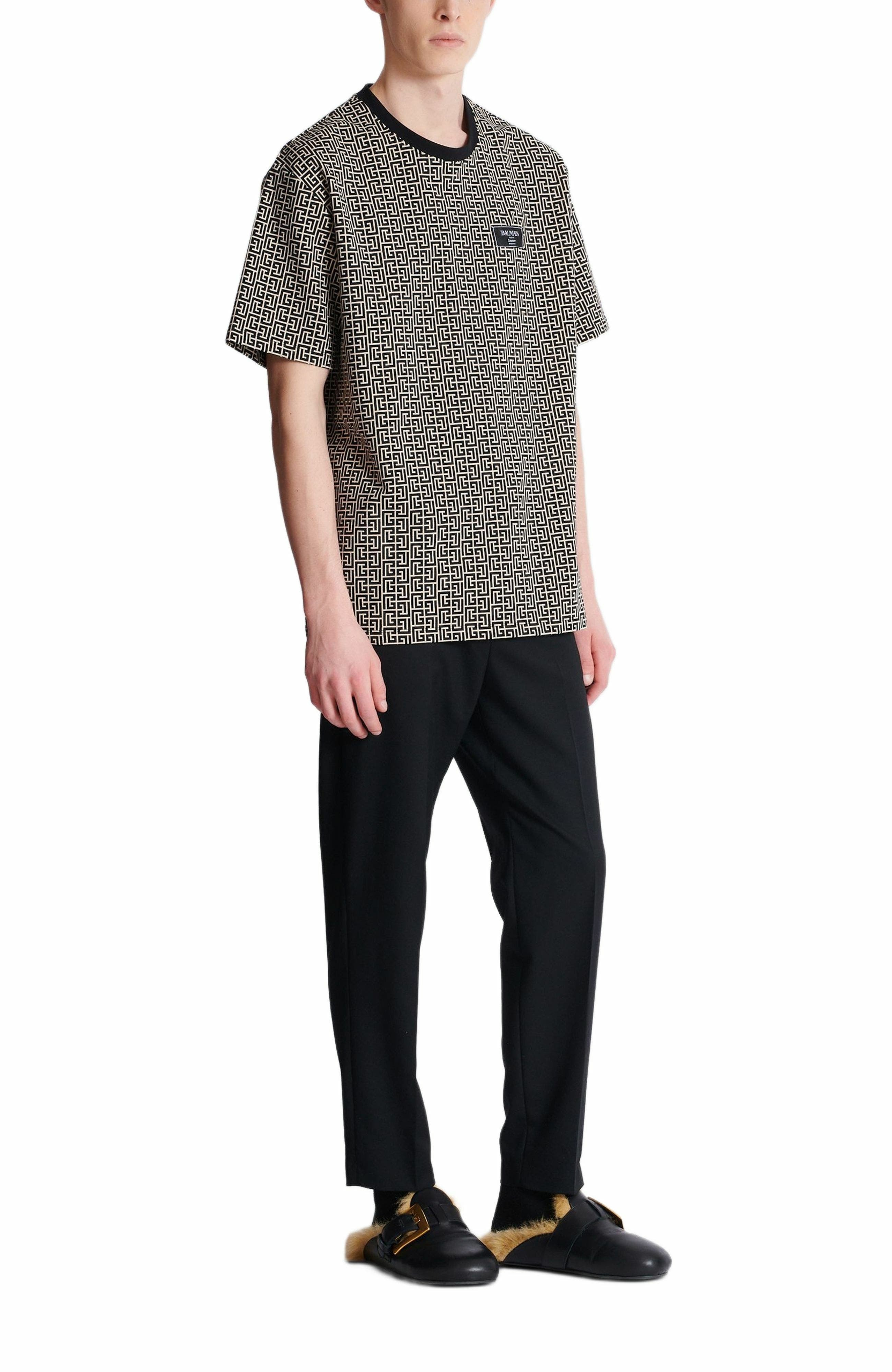 PB Labyrinth jacquard T-shirt Round neck with contrasting ribbed trim Short sleeves Woven Balmain Couture label on the chest Regular fit Model measures 190cm and wears a size M Main material: 95% cotton 5% elastane Made in Portugal Item: FH1EG000BC90 100% of the cotton fibres used to make this garment are certified and organically farmed