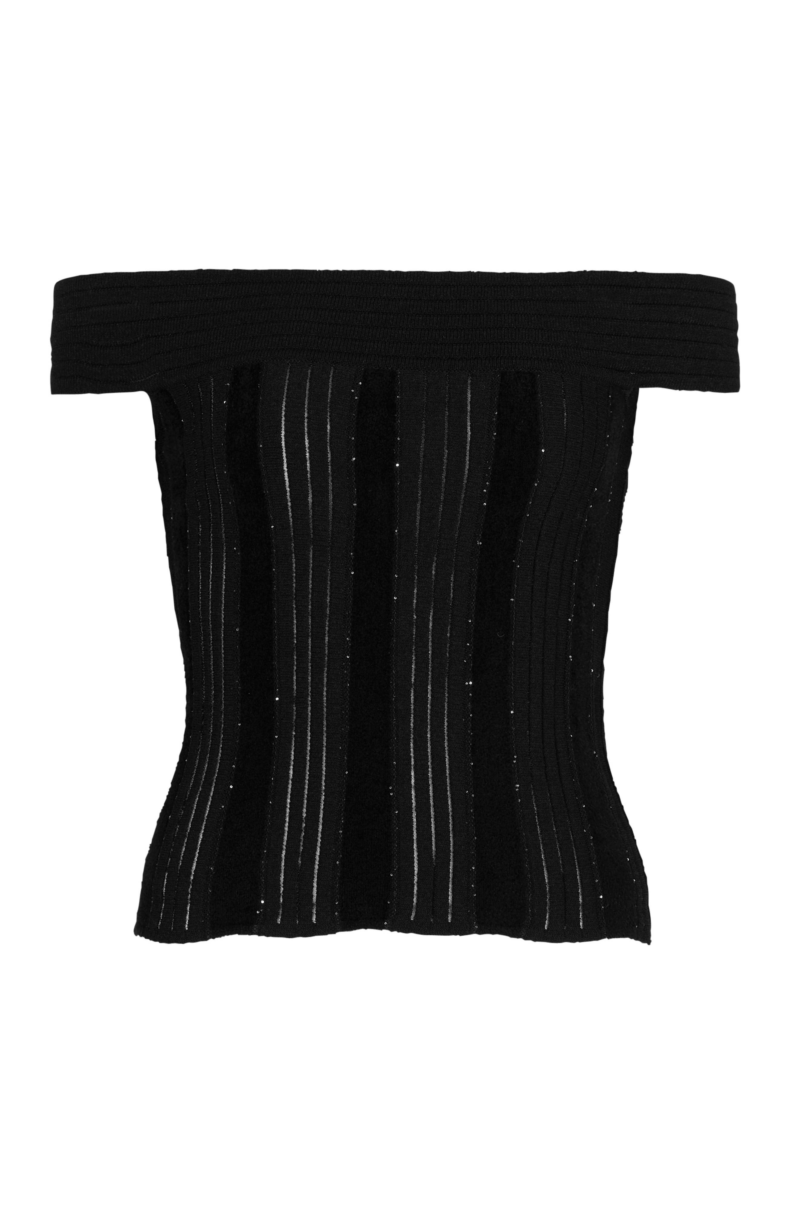 Off-the-shoulder glitter knit topStraight necklineVelvet and tube knitCropped, fitted cutModel measures 177cm and wears a size 36Main material: 77% viscose 15% polyester 8% polyamideMade in FranceItem: GF1AJ080KJ37 Off-the-shoulder glitter knit top Straight neckline Velvet and tube knit Cropped, fitted cut Model measures 177cm and wears a size 36 Main material: 77% viscose 15% polyester 8% polyamide Made in France Item: GF1AJ080KJ37