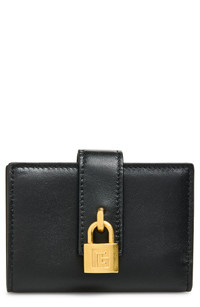 An engraved padlock marks the strap of this Italian-crafted lambskin-leather coin purse that includes two handy card slots. 3" x 4" Two card slots; snap coin purse Leather Made in Italy