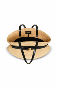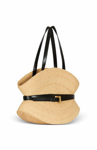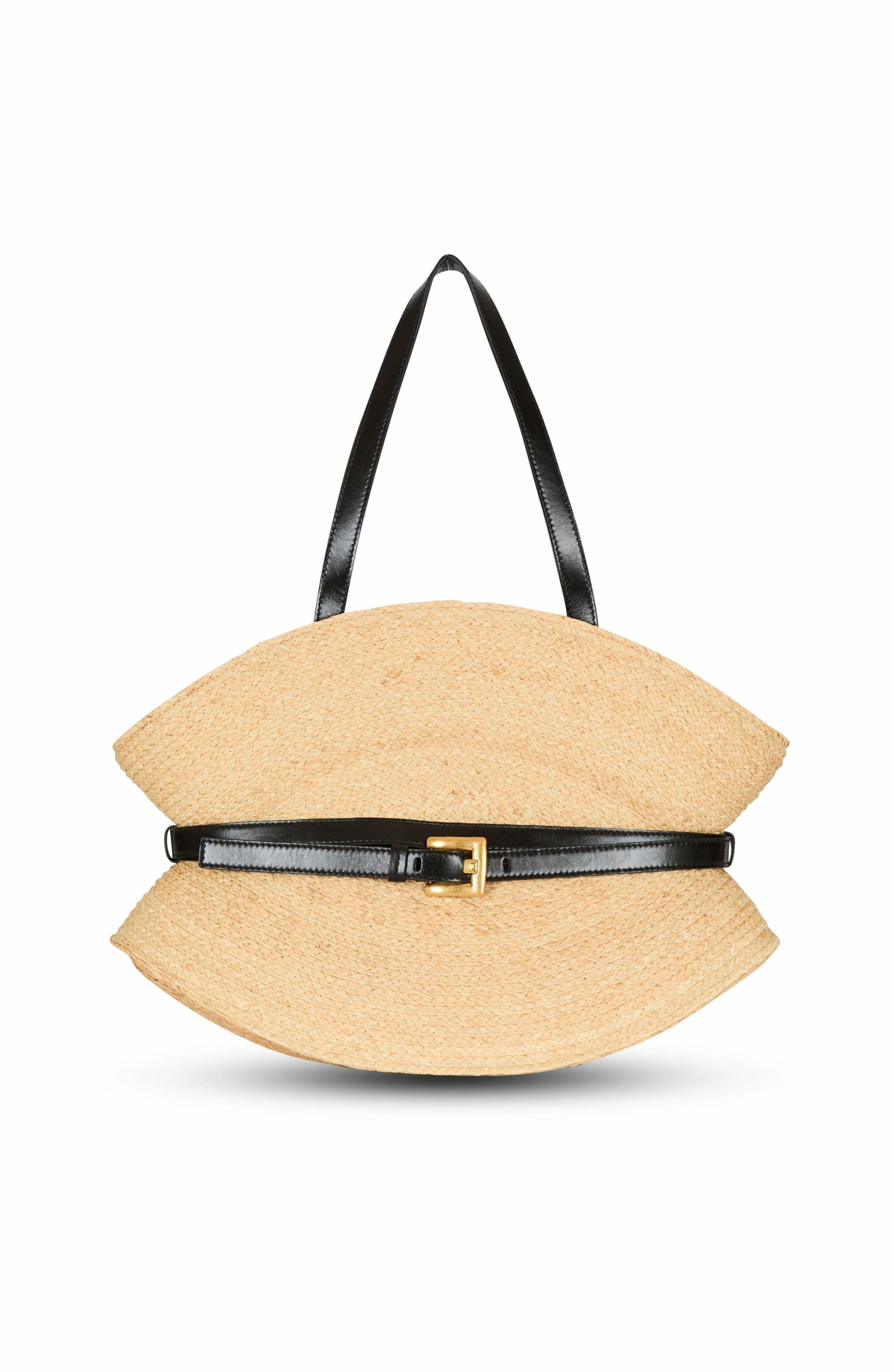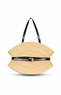 Shuffle Medium bag in calfskin leather and raffia Belted style Carry in the hand or wear on the shoulder Leather handles Double-wrap belt Metal PB-engraved buckle Leather tie fastening Inside leather pocket and card pocket Faux suede lining Gold hardware Dimensions: 16 x 45.5 x 31 cm Main material: 100% raffia Made in Italy Item: FN1DQ023TRBO