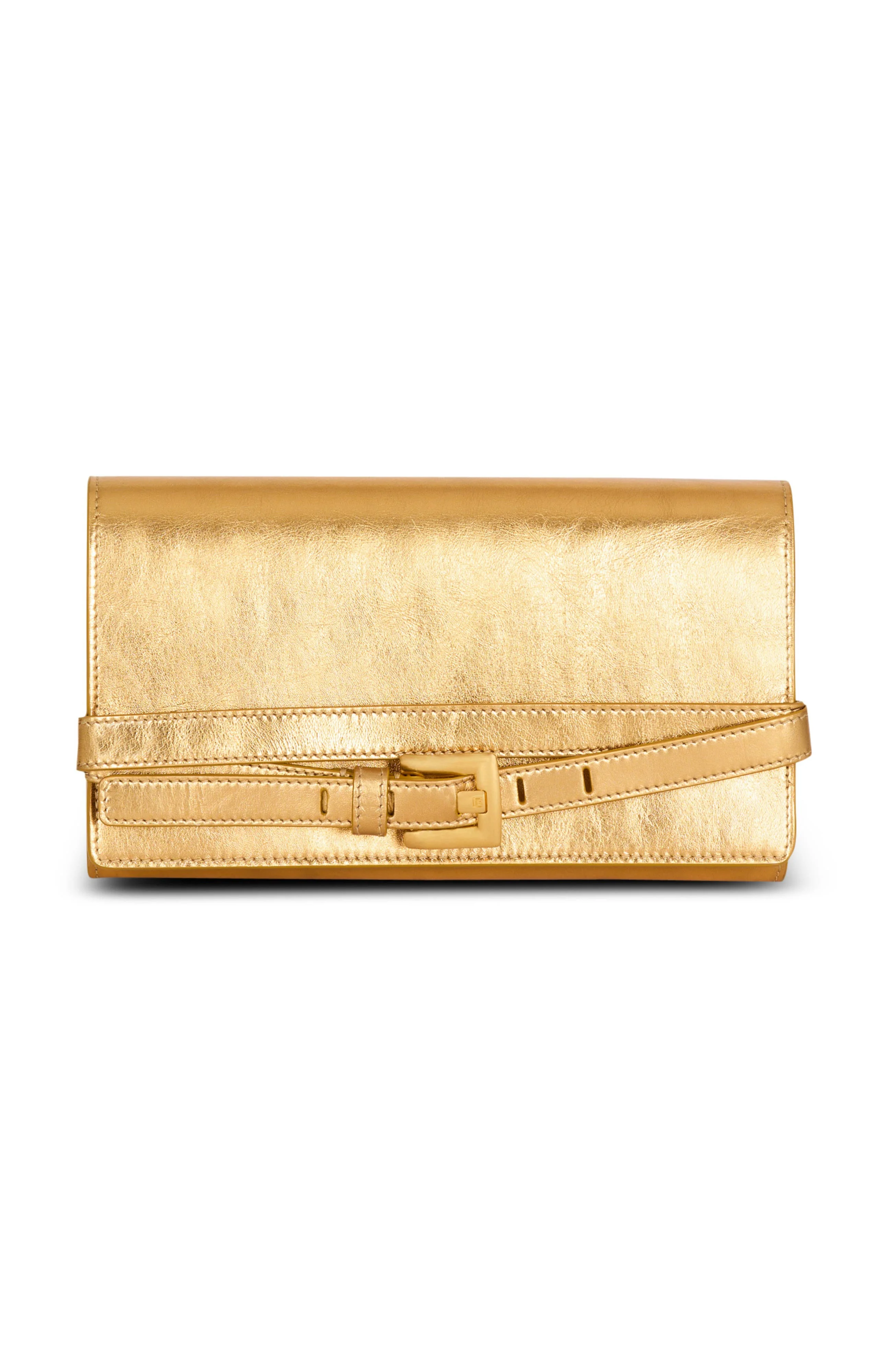 Shuffle wallet in lamb leatherBelted styleCarry in the hand, on the shoulder or across the bodyDetachable chain and leather shoulder strapFlap with belt embellished with a metal buckleEmbossed Balmain Paris logo on the backMagnetic fasteningLeather card pocket, embossed Balmain logoLeather liningGold hardwareDimensions: 2.5 x 21 x 12cmMain material: 100% calfskinMade in ItalyItem: GN1ON259LMLO Shuffle wallet in lamb leather Belted style Carry in the hand, on the shoulder or across the body Detachable chain and leather shoulder strap Flap with belt embellished with a metal buckle Embossed Balmain Paris logo on the back Magnetic fastening Leather card pocket, embossed Balmain logo Leather lining Gold hardware Dimensions: 2.5 x 21 x 12cm Main material: 100% calfskin Made in Italy Item: GN1ON259LMLO