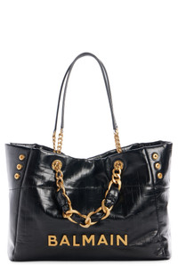 The PB Labyrinth monogram is embossed on the soft calfskin of this sized-down-but-still-spacious tote that pops with galvanized, golden hardware. Olivier Rousteing's 1945 collection highlights the bold optimism behind the house's founding with bags inspired by some of Pierre Balmain’s strongest midcentury designs. Magnetic-snap closure Top carry handles; shoulder straps Interior snap pocket Snap gussets Structured silhouette with flat base and protective metal feet Leather Made in Italy Designer Handbags