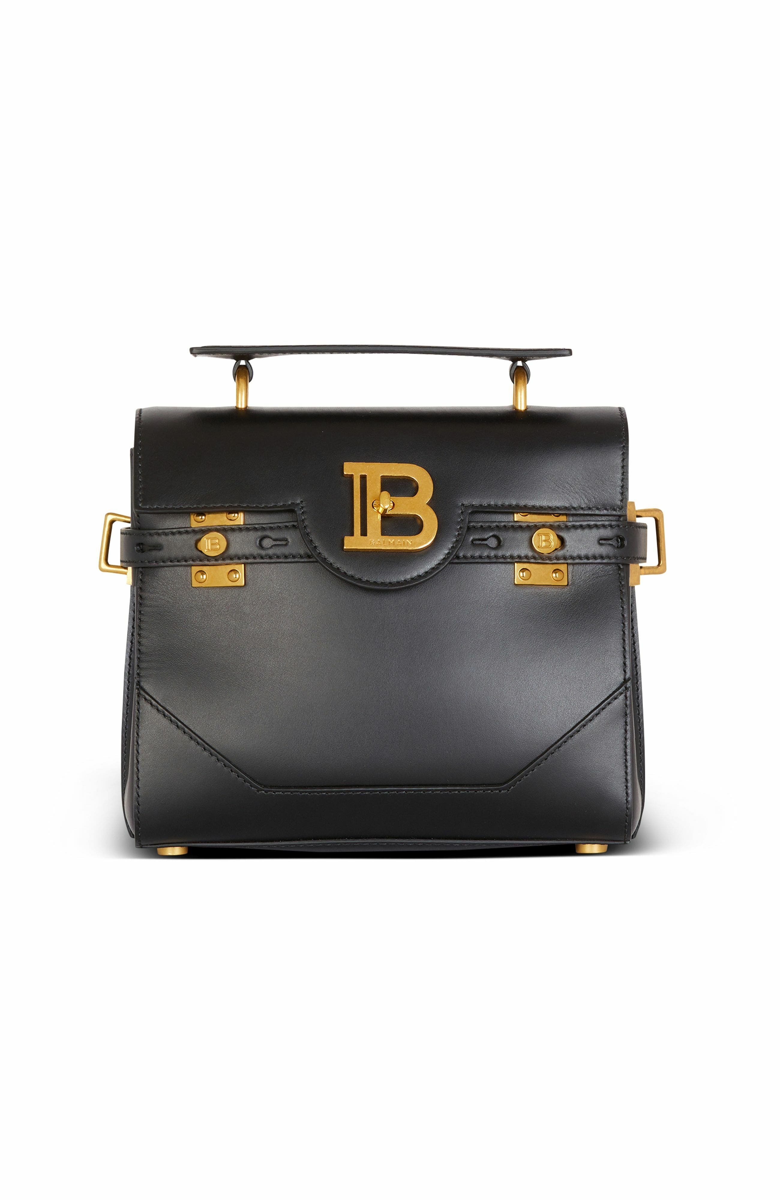 Smooth leather B-Buzz 23 bag Smooth leather B-Buzz 23 bag Handle and detachable shoulder strap with Balmain engraved snap hooks Flap with B-Twist quarter-turn clasp Patch pocket at the back Zipped pocket, card holder slot and embossed logo on the inside Reinforced bottom and metal bag feet Golden hardware
