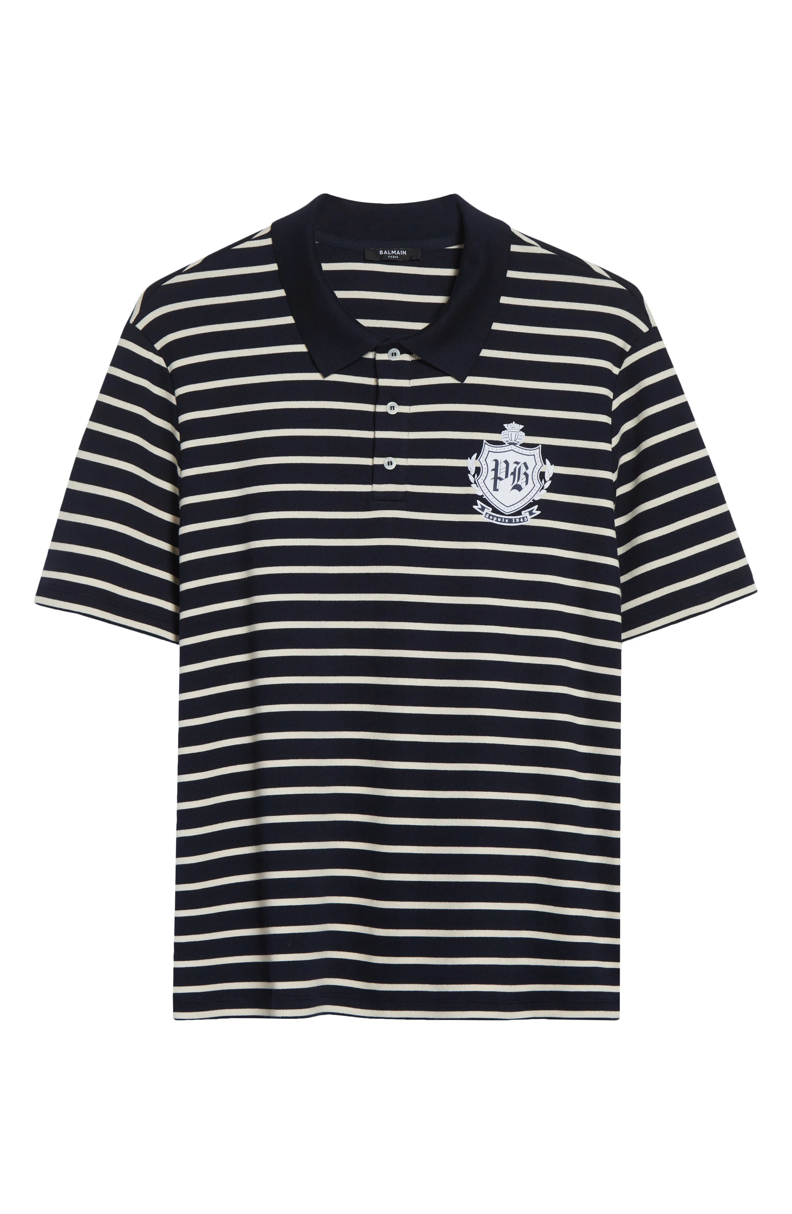 Balmain's casual game graduates with honors this season, thanks in part to this preppy striped polo regally detailed with a collegiate crest featuring founder Pierre Balmain's monogram. Button half placket Spread collar Short sleeves 97% cotton, 3% elastane Dry clean Made in Portugal Designer Clothing