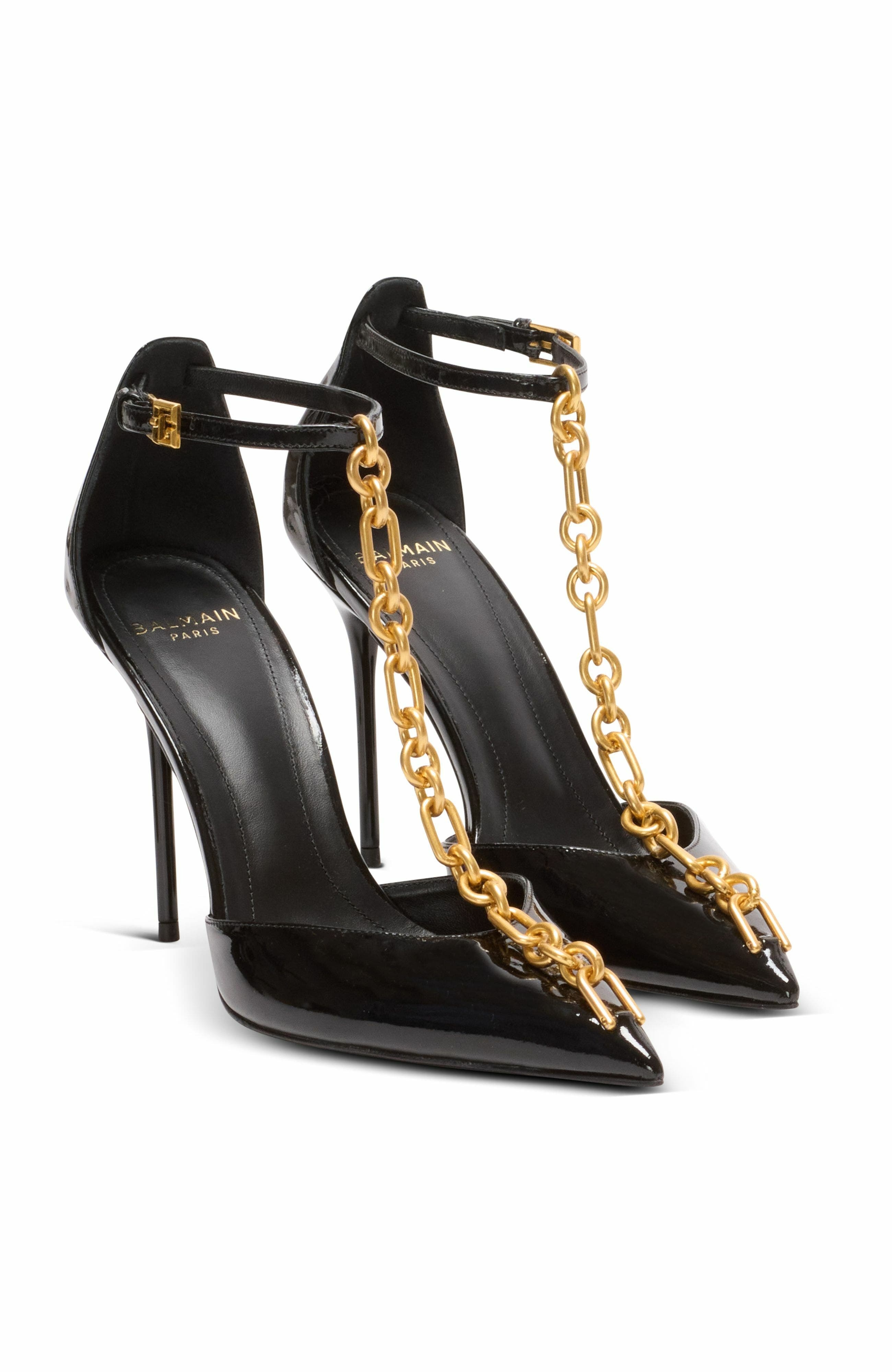 Sync patent leather stilettos Pointed toe Adjustable ankle strap with metal PB buckle Metal chains on the front Gold hardware Matching leather-covered stiletto heel Leather outer sole, insole and lining Heel height: 9.5 cm Main material: 100% calfskin Made in Italy Item: FN1UA152LPAT