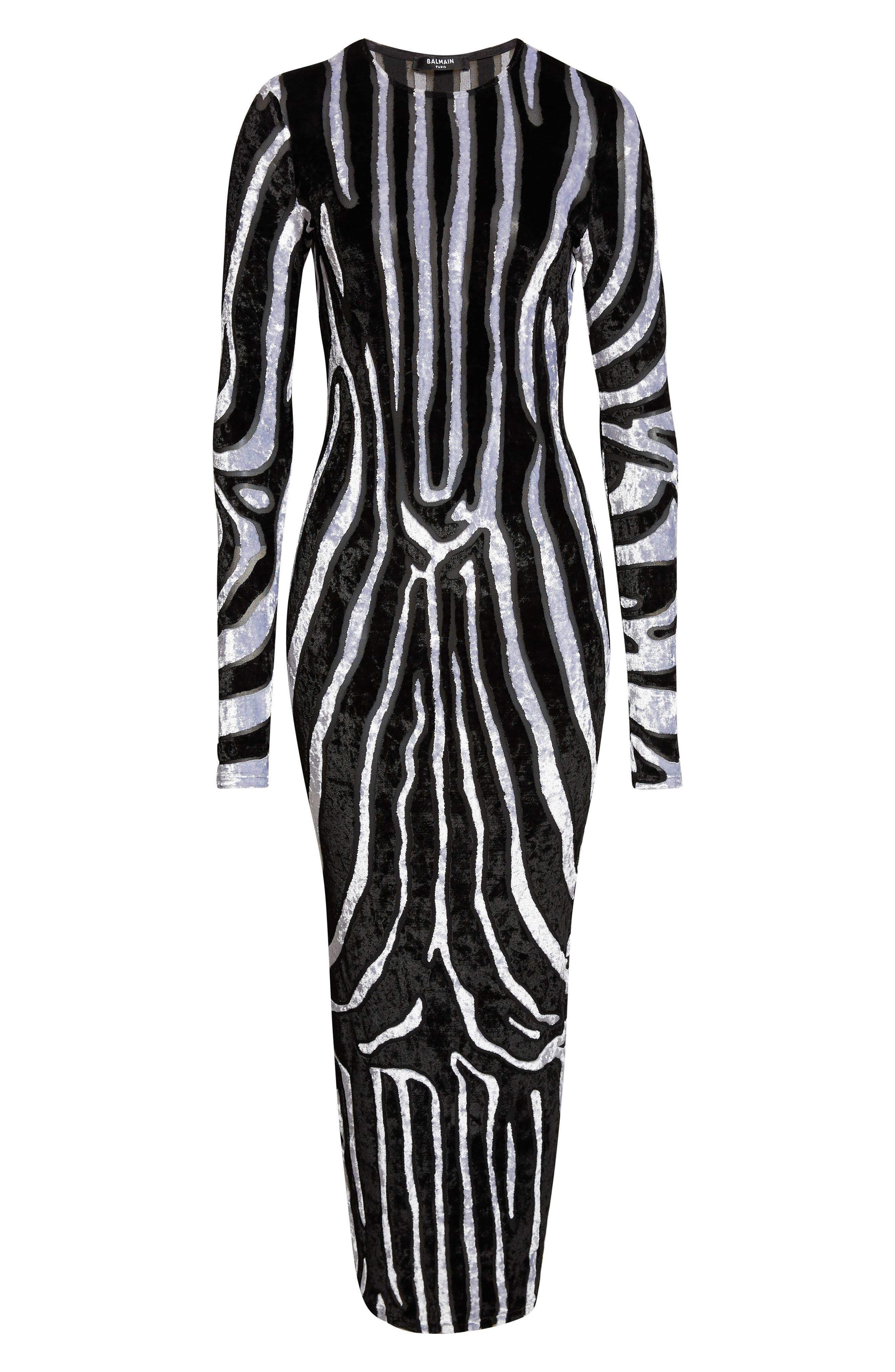 Olivier Rousteing unleashed new takes on zebra stripes this season—including the plush velvet versions streaking this quintessentially Balmain body-con dress winked with a sultry back cutout for a memorable exit. Jewel neck Long sleeves 89% viscose, 11% elastane Dry clean Imported Designer Clothing