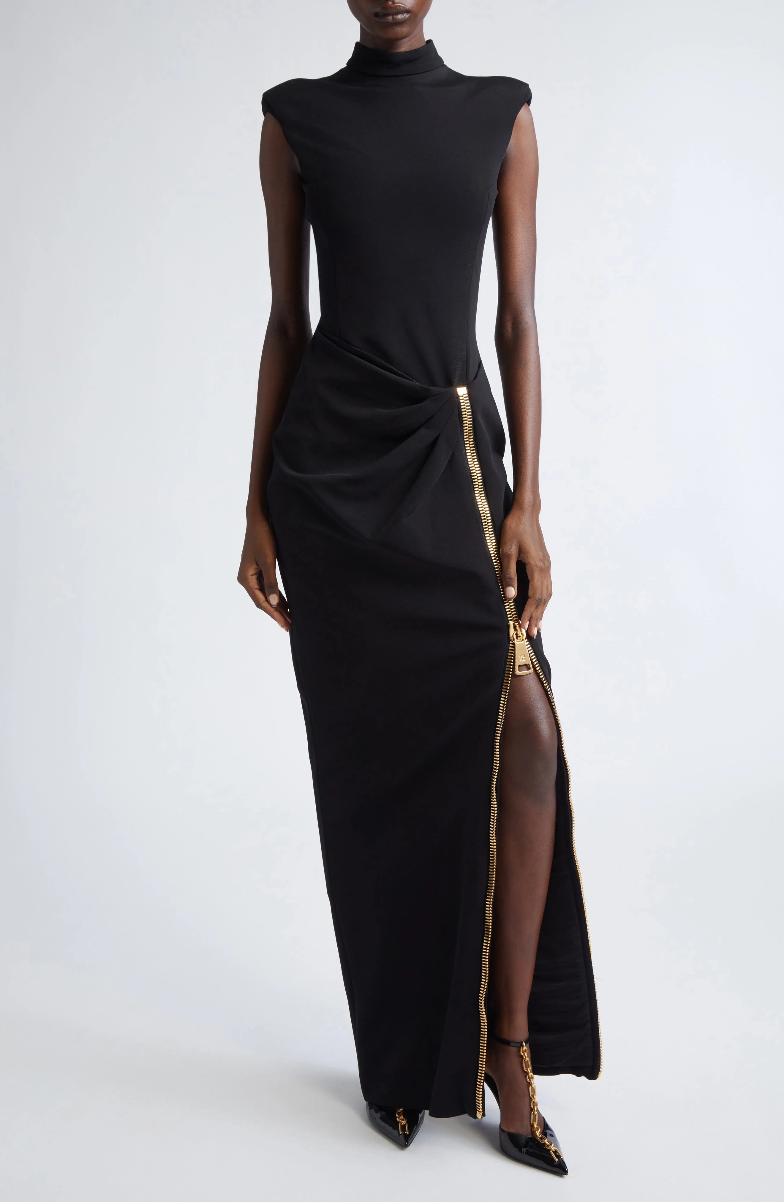 Compact jersey contours to your curves in this quintessentially Balmain dress that commands attention with its padded shoulders and gilded, statement-scale zipper that reveals a sultry side slit. Hidden back-zip closure Mock neck Sleeveless Zip side slit 80% viscose, 16% polyamide, 4% elastane Dry clean Made in Portugal Designer Clothing