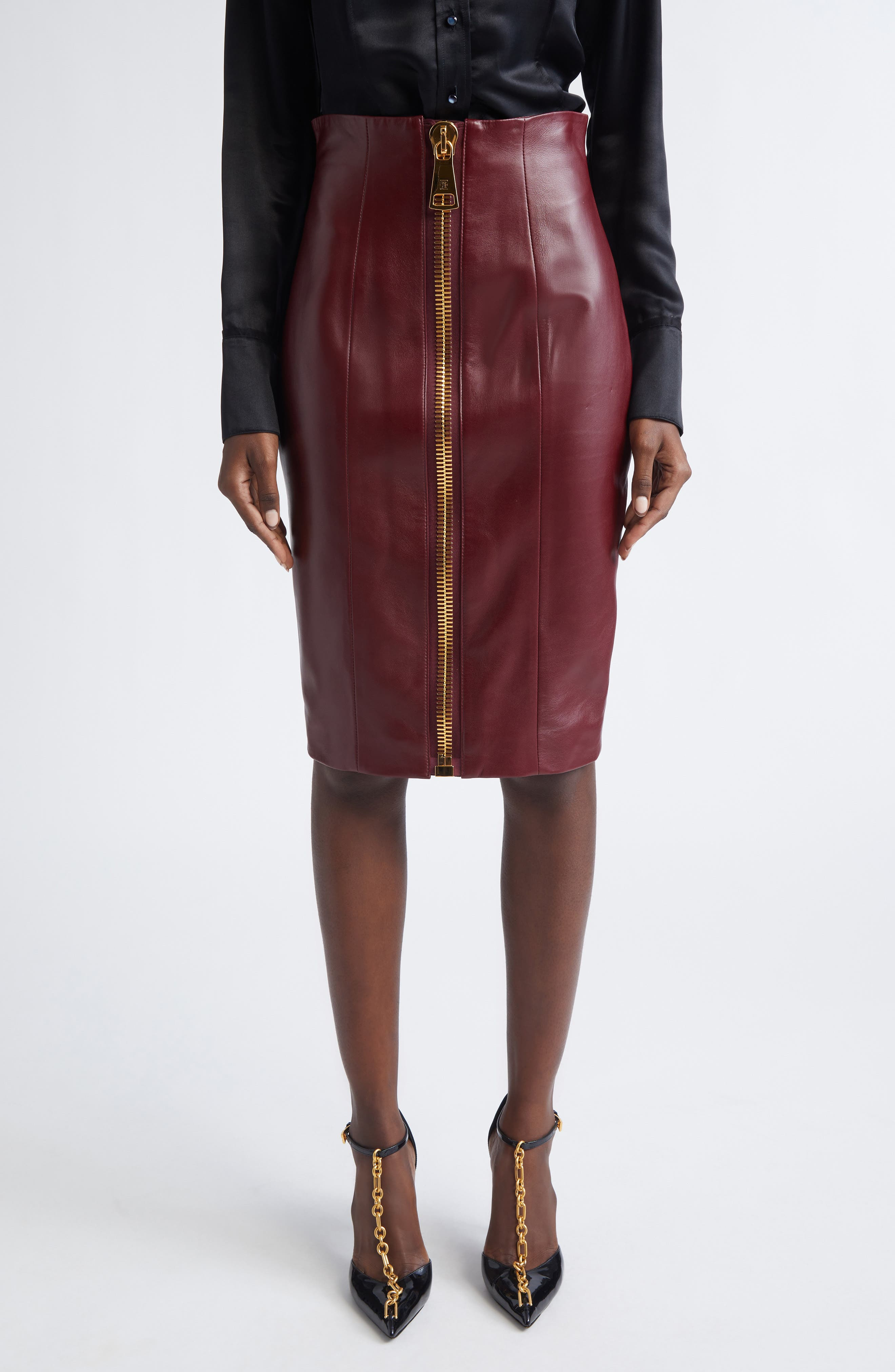 Balmain Zipped High Waist Lambskin Leather Pencil Skirt in Burgundy at Nordstrom