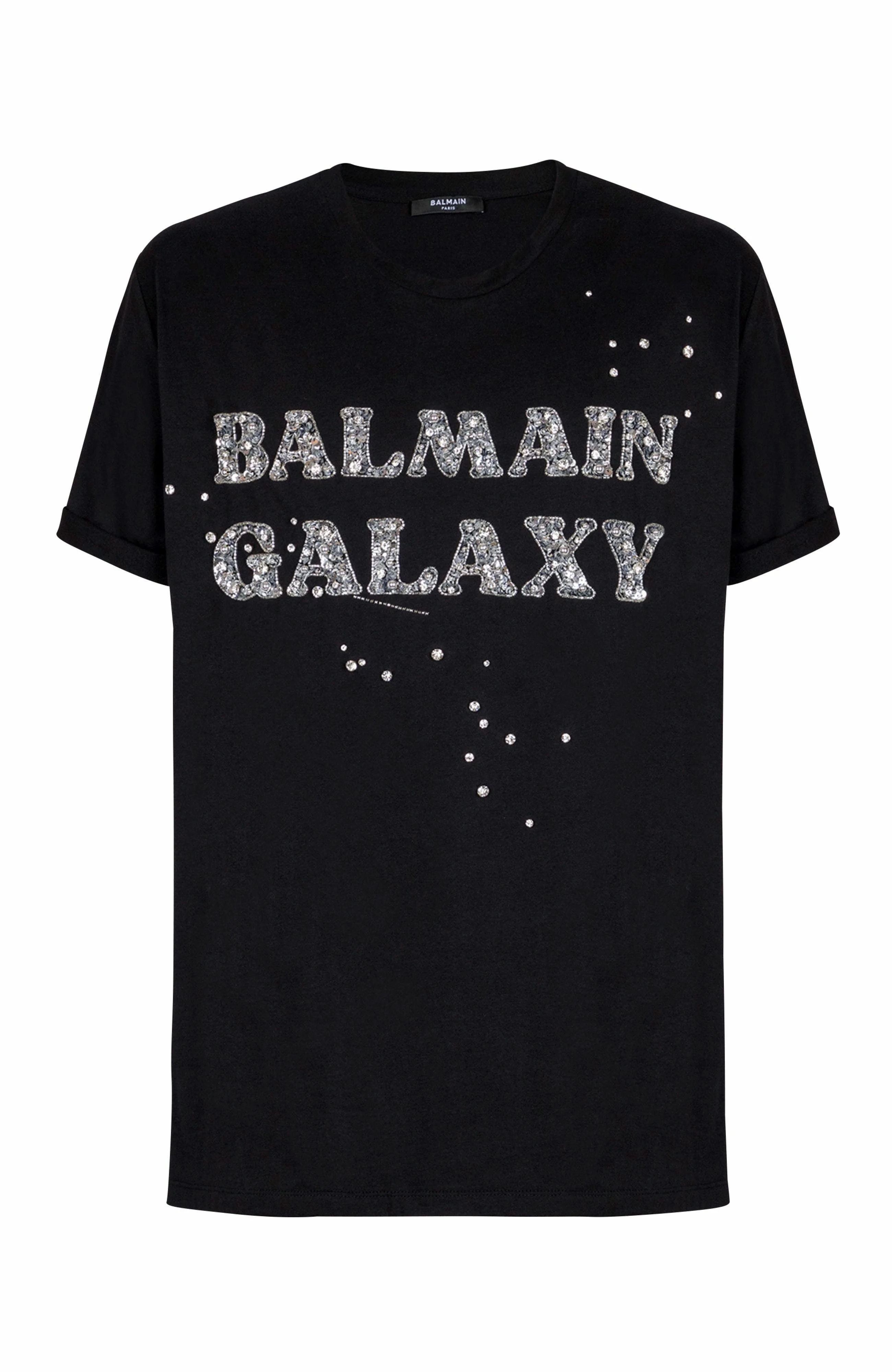 Embroidered Balmain Galaxy T-shirtRound neck with ribbed trimShort cuffed sleevesBalmain Galaxy logo embroidered on the frontSequin, bead and rhinestone embroideryRegular fitModel measures 188cm and wears a size MMain material: 100% cottonMade in IndiaItem: EH0EG136PC76 Embroidered Balmain Galaxy T-shirt Round neck with ribbed trim Short cuffed sleeves Balmain Galaxy logo embroidered on the front Sequin, bead and rhinestone embroidery Regular fit Model measures 188cm and wears a size M