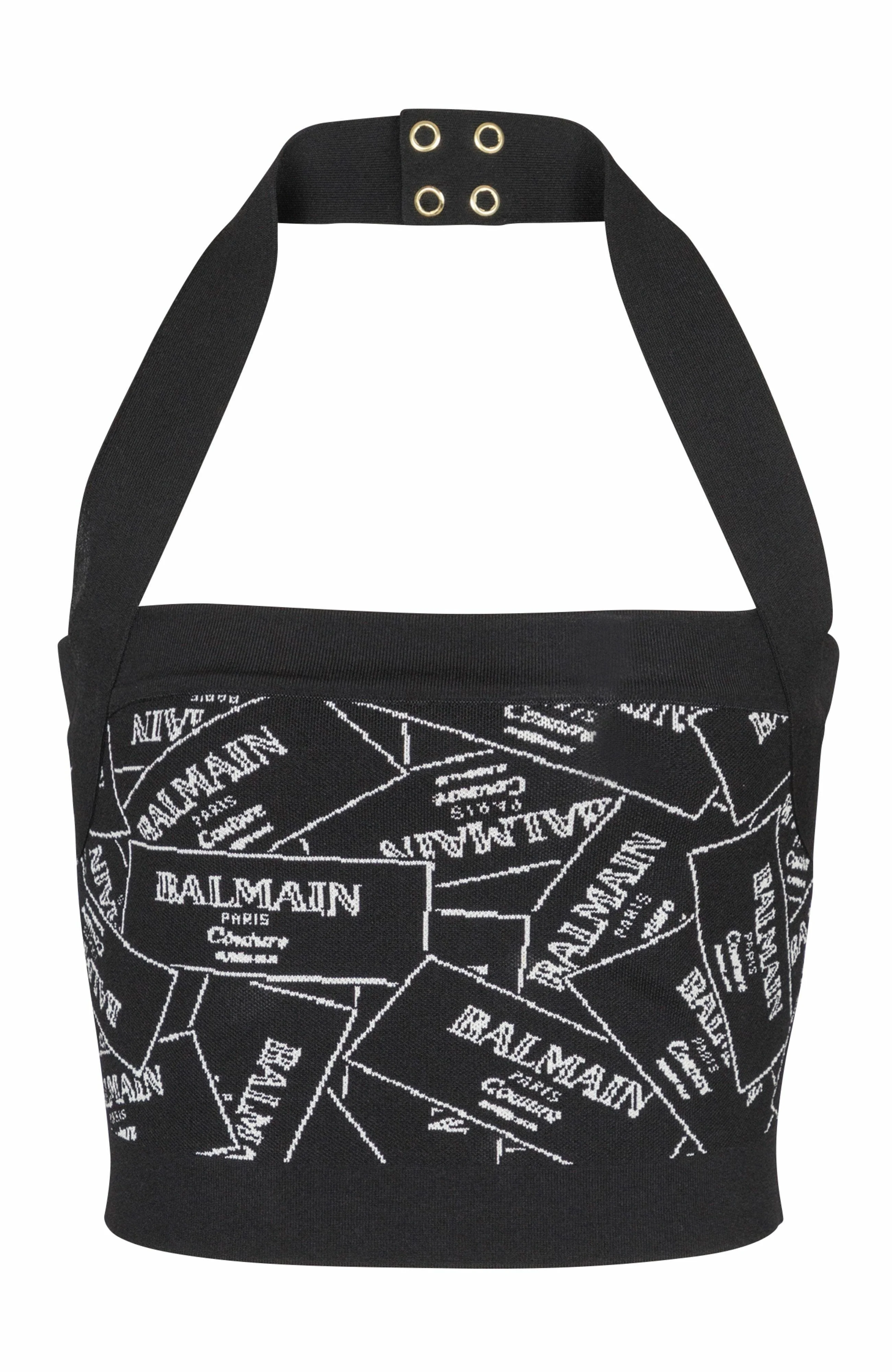 Knit halterneck top with all-over Balmain label motifSquare necklineFastening at the neck with 4 "Double Chain Lion" press studsVisible metal zip fastening on the back with Balmain-engraved sliderGold hardwarePlain ribbed edgingCropped slim fitModel measures 178cm and wears a size 36Main material: 84% viscose 16% polyesterMade in ItalyItem: EF1AA025KH86100% of the viscose fibres used to make this garment come from certified, sustainably managed forests Knit halterneck top with all-over Balmain label motif Square neckline Fastening at the neck with 4 "Double Chain Lion" press studs Visible metal zip fastening on the back with Balmain-engraved slider Gold hardware Plain ribbed edging Cropped slim fit