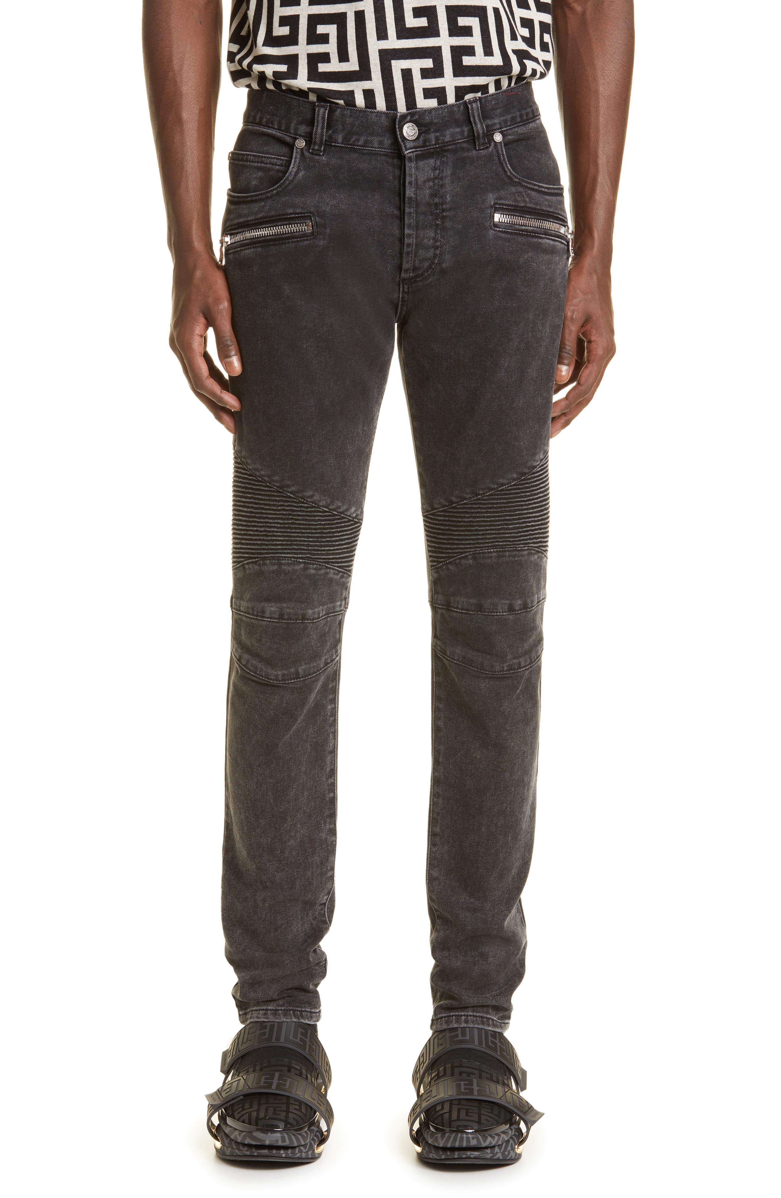 Silvery zips, ribbed panels and articulated knees bring moto edge to slim, tapered jeans cut from stretch denim with a heavily faded black wash. 31 1/2" inseam; 12" leg opening; 10" front rise; 14" back rise (size 32) Zip fly with button closure Five-pocket style; front zip pockets 98% cotton, 2% elastane Machine wash, dry flat Made in Italy Men's Designer Clothing