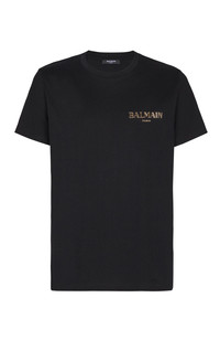 T-shirt with vintage gel Balmain logo Round neck with ribbed trim Short sleeves Vintage Balmain logo in gel on the chest Slim fit Model measures 190cm and wears a size M Main material: 100% cotton Made in Bulgaria Item: FH1EF000GD84 100% of the cotton fibres used to make this garment are certified and organically farmed