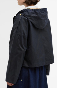 A boxy cut and proportions exaggerated to just the right degree make this waxed-cotton jacket a must-wear for casual rainy-day outings. Show off the signature tartan lining when the hood is down and the cuffs are turned up. Two-way front-zip closure with snap storm placket Drawstring hood Dropped shoulders Side welt pockets Epaulets Lined 100% cotton with wax coating Spot clean Imported