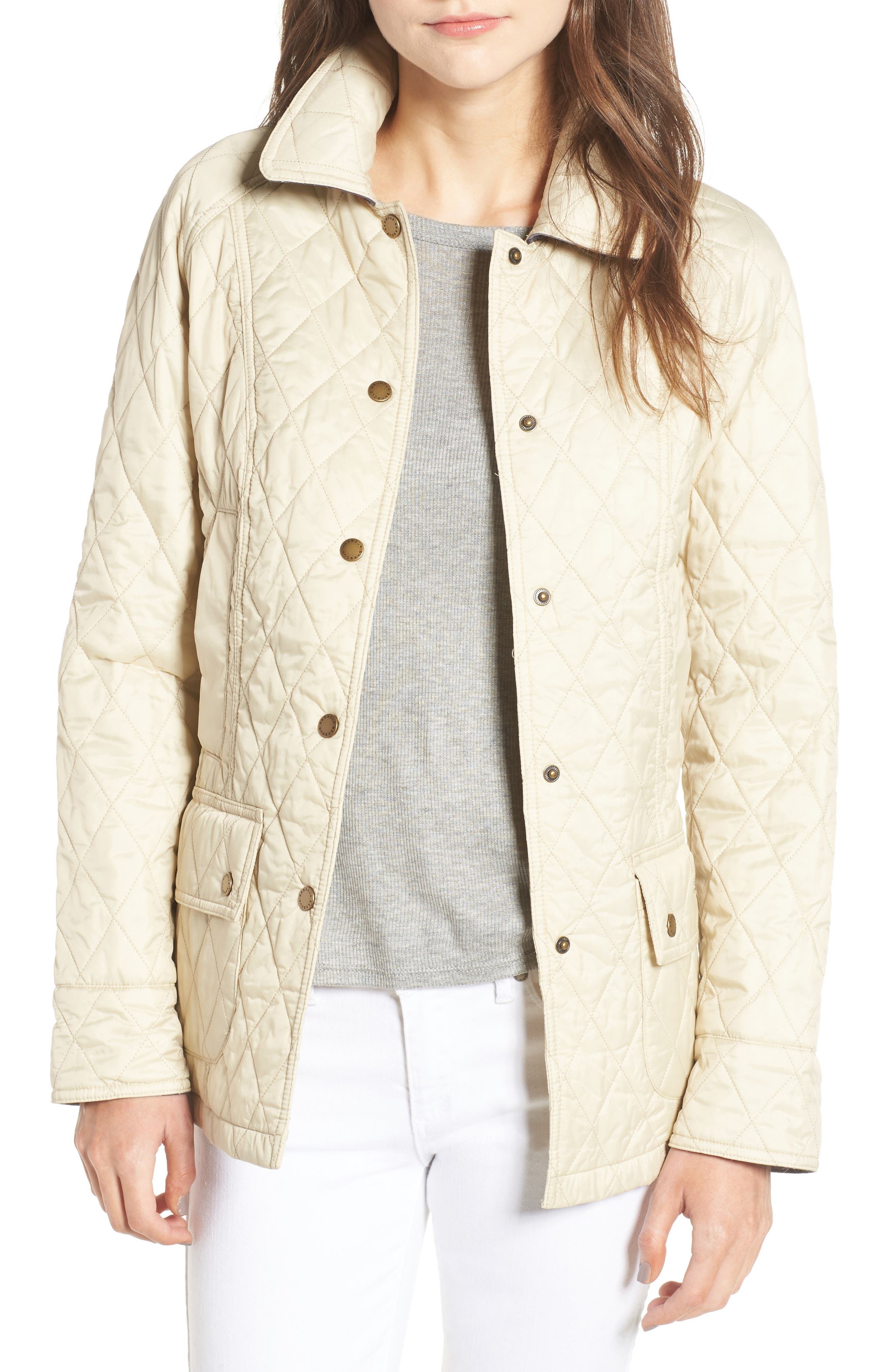 A lighter, packable version of Barbour's iconic quilted jacket is shaped for a feminine yet relaxed fit with raglan sleeves and princess seams. Heritage details include a water-resistant, diamond-quilted shell and double vents with snap closures in back. Flip up the collar and roll the cuffs to show off the signature tartan lining. 26 1/2" length (size 8). Front snap closure. Hand-warmer pockets; front snap-flap pockets. Water-resistant. Lined. 100% polyamide. Dry clean or machine wash warm, line dry. By Barbour; imported. Coats.