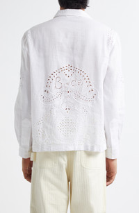 Drawing inspiration from a 19th-century bed jacket, this linen button-up is elevated with reproduced broderie anglaise lacework featuring a subtle "Bode" motif across the back. Front button-and-loop closure Convertible collar Long sleeves with button-and-loop cuffs 100% linen Dry clean Imported Designer Clothing