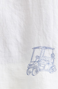 Drawing inspiration from a 1980s golf tablecloth, this shirt is adorned with embroidered single-thread illustrations of classic golf imagery—a player, a hole and a cart. Appliqued trim details at the collar, hem and cuffs add a refined touch to this nostalgic yet elevated piece. Front button closure Notched collar Short sleeves 100% linen Dry clean Imported Designer Clothing