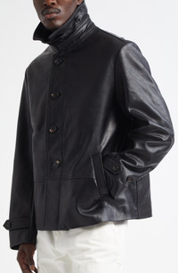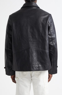 An aviator's coat from the First World War inspires this leather jacket that reproduces the original's throat-latch collar, pointed back yoke, and oversized horn buttons. Front button closure Spread collar with button throat latch Adjustable button-tab cuffs Front welt pockets Leather Professional leather clean Imported Designer Clothing