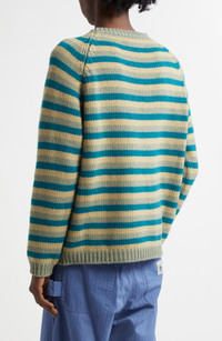 Bode reproduces the blue-green stripes found on an early 20th-century knit bathing suit and translates them to this lookbook-featured raglan-sleeve sweater knit from wool yarn. Crewneck Long sleeves Ribbed cuffs and hem 100% wool Dry clean Made in Italy Designer Clothing