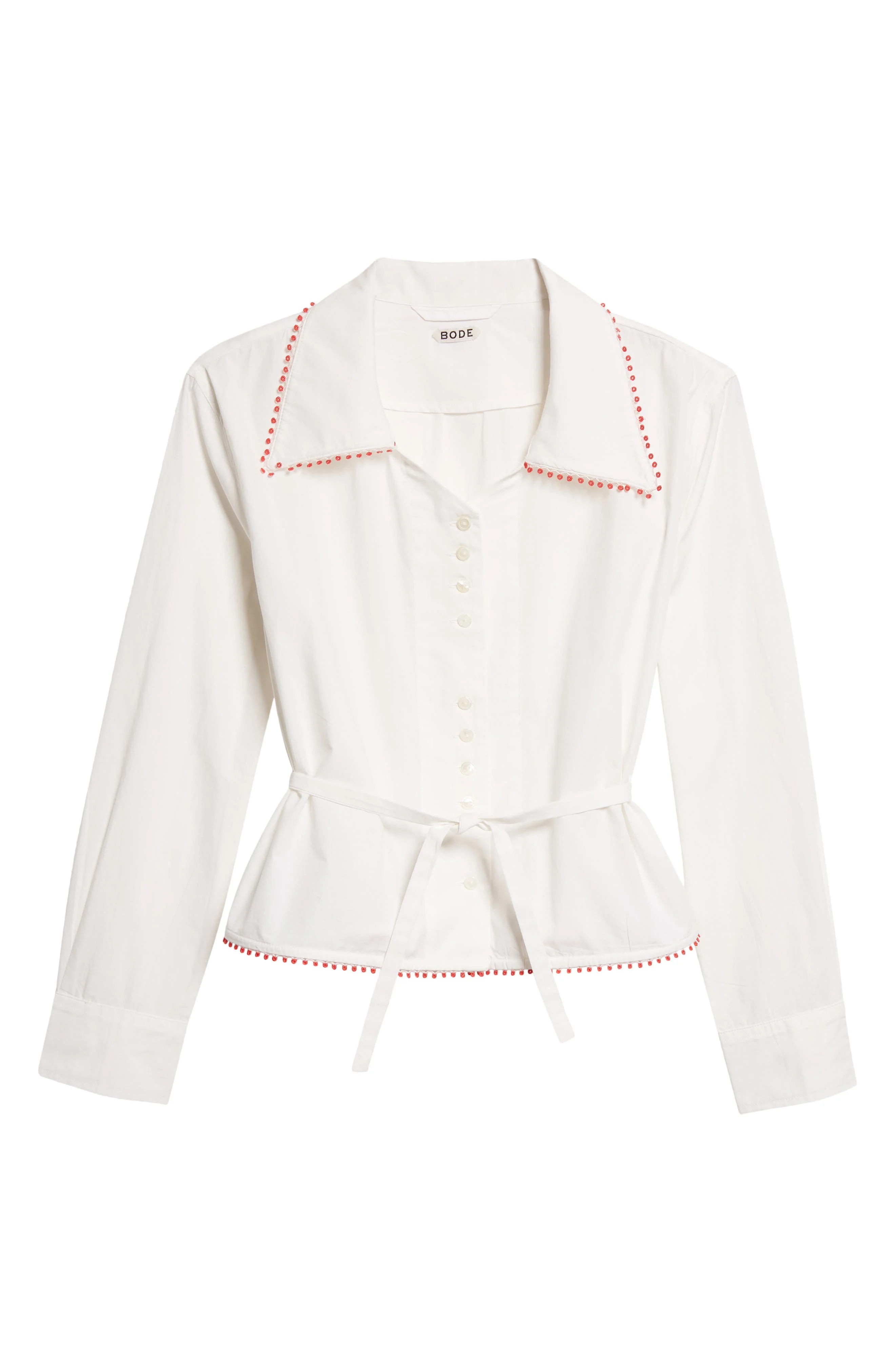 Red bud passementerie traces the wide spread collar and hem of this poplin shirt with an attached sash that allows for a cinched fit or peplum-flared silhouette. Front button closure V-neck; spread collar Long sleeves with button cuffs Attached sash 100% cotton Dry clean Imported Designer Clothing
