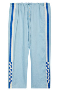 Channeling the nostalgic whimsy of a midcentury dish towel, these breezy linen pants boast bold side stripes and playful leaf appliques near the hem and at the back. Drawstring waist; button fly Front welt pockets; back patch pocket 100% linen Dry clean Imported Designer Clothing