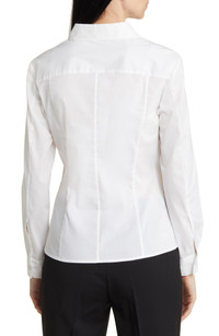 A clean front makes this blouse cut from a soft cotton blend easy to style up or down. 25" length (size 8) Hidden side-zip closure Spread collar Long sleeves with button cuffs 72% cotton, 28% polyester Machine wash, line dry Imported Hugo Boss/BOSS/HUGO has received the Fair Labor Association accreditation, which signifies that the company has effective systems and procedures in place to successfully uphold fair labor standards throughout its supply chains, including strategies and tools to address and improve working conditions
