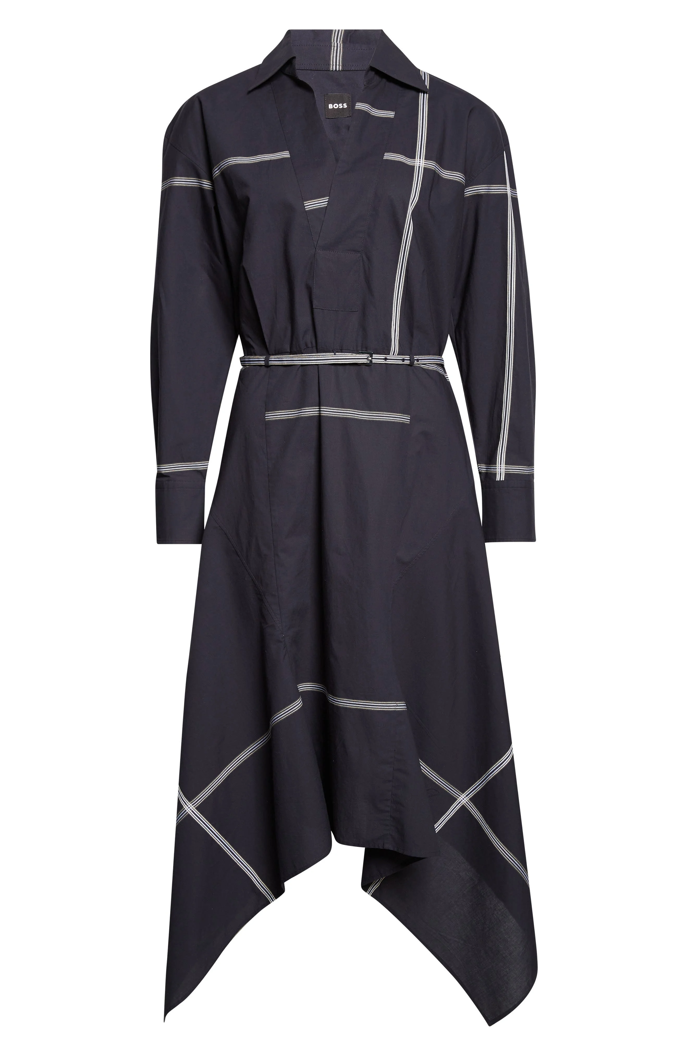 Placed ribbon details and a twirlable hem add charm points to a polished dress cut from crisp cotton. Slips on over head Spread collar Split neck Long sleeves Removable belt 100% cotton Machine wash, line dry Imported