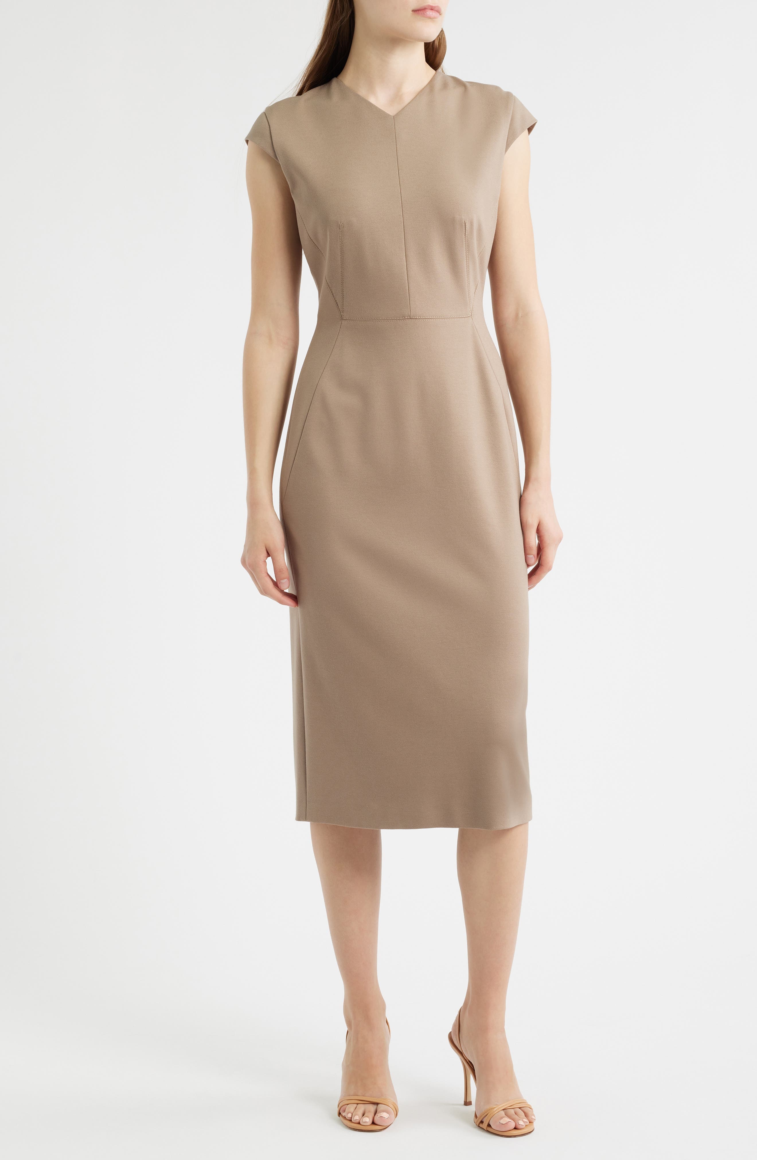 Transition from desk to dinner in this sophisticated sheath made with a kiss of stretch for shape-retaining power and framed by slight sleeves. 44" length Hidden back-zip closure V-neck Cap sleeves Back slit Lined 65% viscose, 30% polyamide, 5% elastane Dry clean Made in Portugal