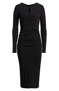 Move stylishly from day to night in this curve-sculpting midi topped with an airy keyhole cutout and accented with rippled ruching. 43" length Slips on over head Jewel neck Long sleeves 100% viscose Machine wash, line dry Imported