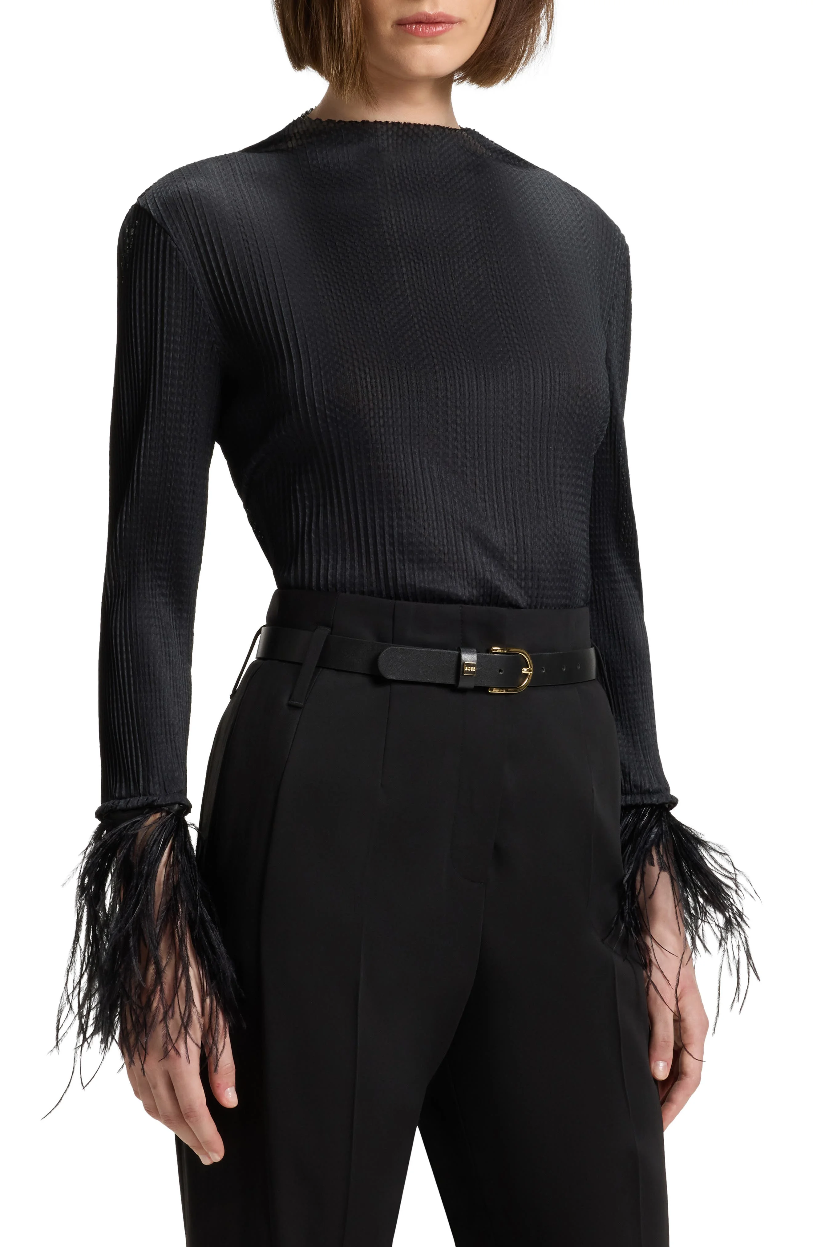 PLISSÉ JACQUARD TOP WITH DETACHABLE FEATHER CUFF TRIMS