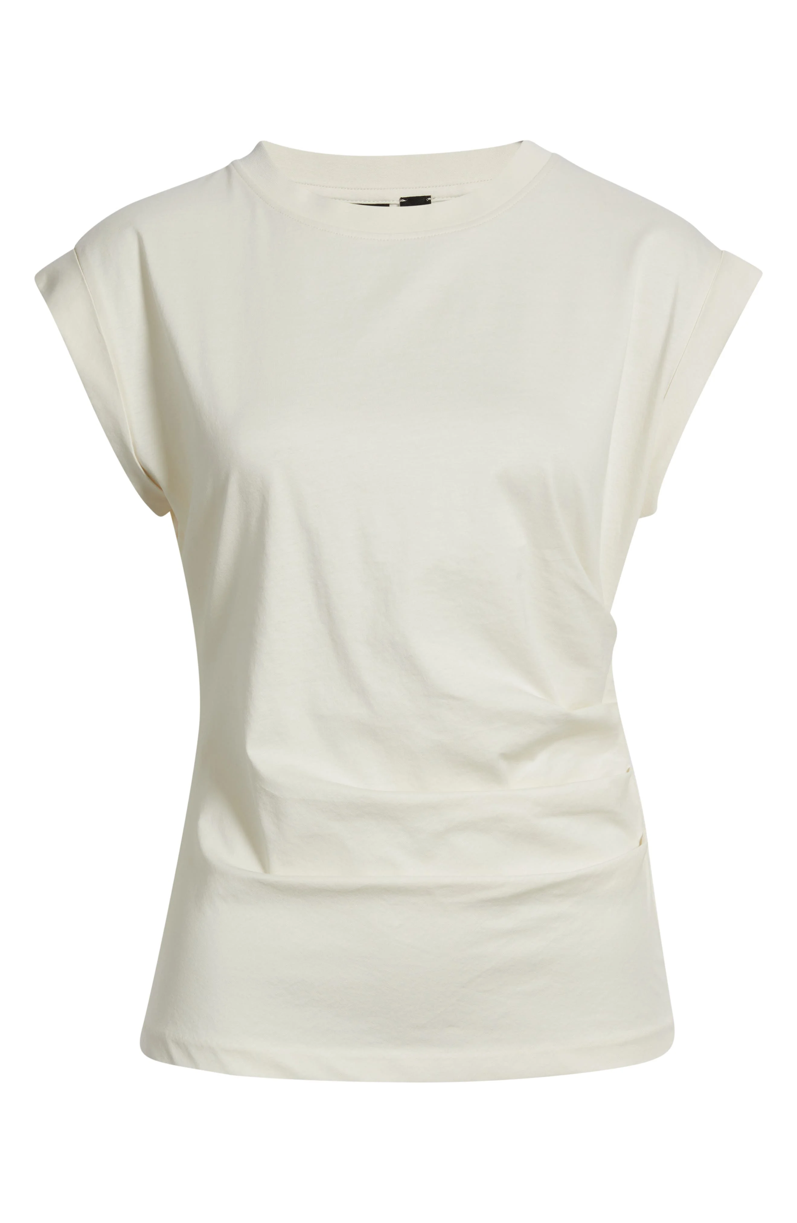This asymmetric top pairs structured shoulders with fluid draping. Cut from lightweight jersey, it balances sharp lines and effortless wear for a modern, polished look. 23 1/2" length Crewneck Cap sleeves 100% cotton Machine wash, line dry Imported