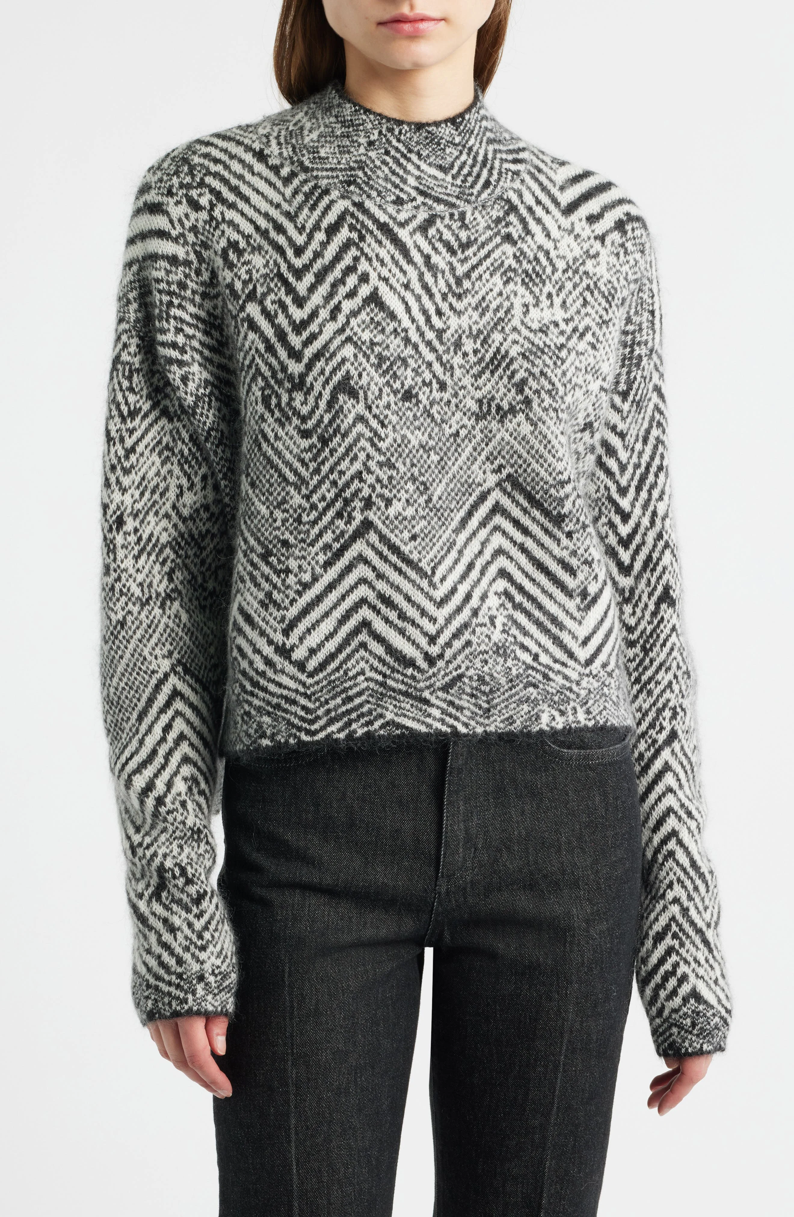 An abstract herringbone pattern covers this woolly sweater framed by dropped shoulders for a relaxed fit. Mock neck Long sleeves 55% mohair, 30% polyamide, 15% wool Hand wash, dry flat Imported