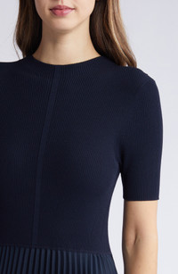 A pleated skirt lends graceful flow to this short-sleeve dress that's ribbed at the bodice and sways with every step you take. Slips on over head Mock neck Short sleeves 76% viscose, 24% polyamide Dry clean or machine wash, line dry Imported Hugo Boss/BOSS/HUGO has received the Fair Labor Association accreditation, which signifies that the company has effective systems and procedures in place to successfully uphold fair labor standards throughout its supply chains, including strategies and tools to address and improve working conditions