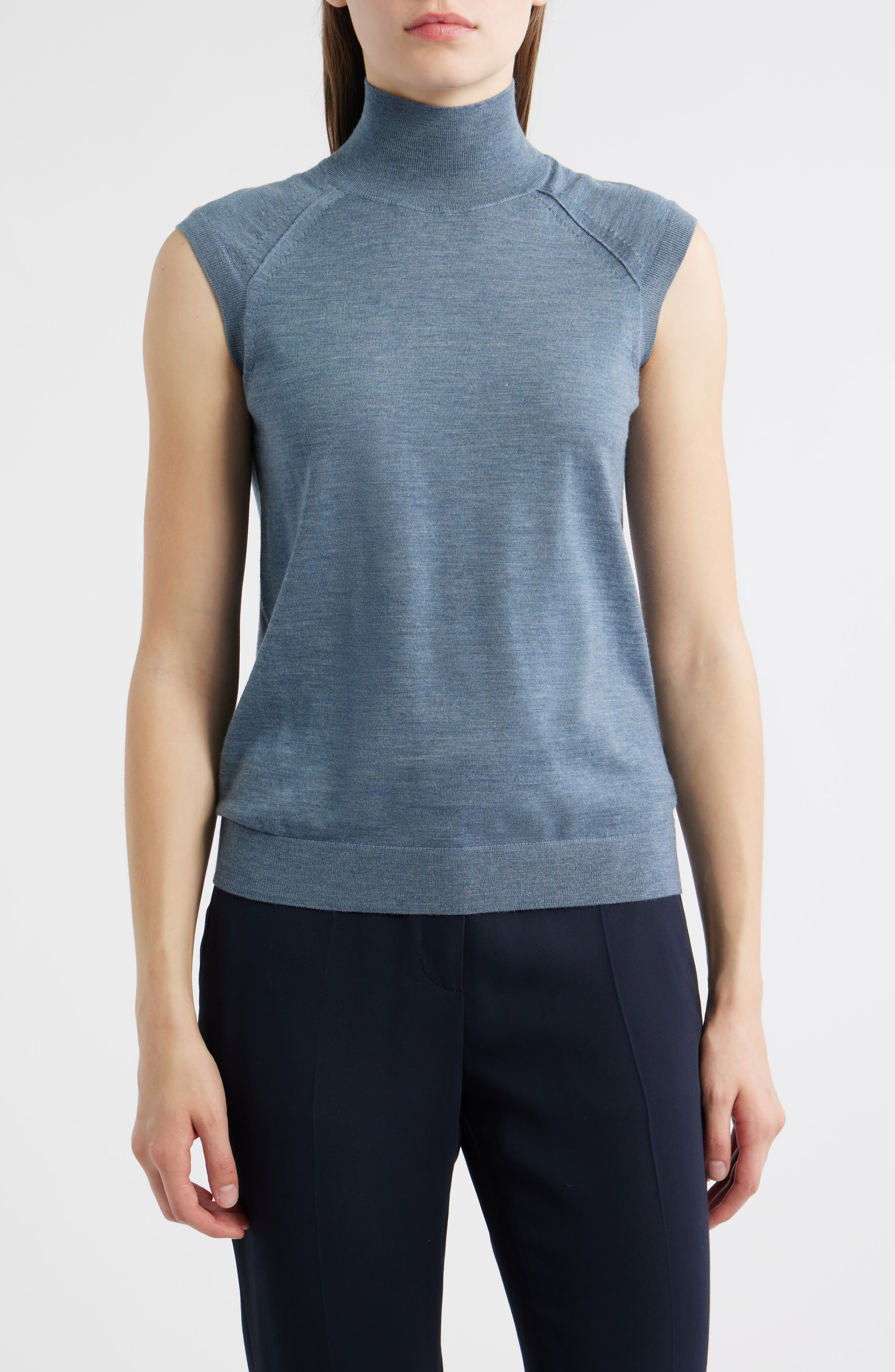 Build out your capsule wardrobe with this wear-with-everything turtleneck sweater knit from luxe virgin wool in a sleeveless silhouette that makes it a dream to style solo or layered. Turtleneck Sleeveless Ribbed hem 100% virgin wool Hand wash, dry flat Imported