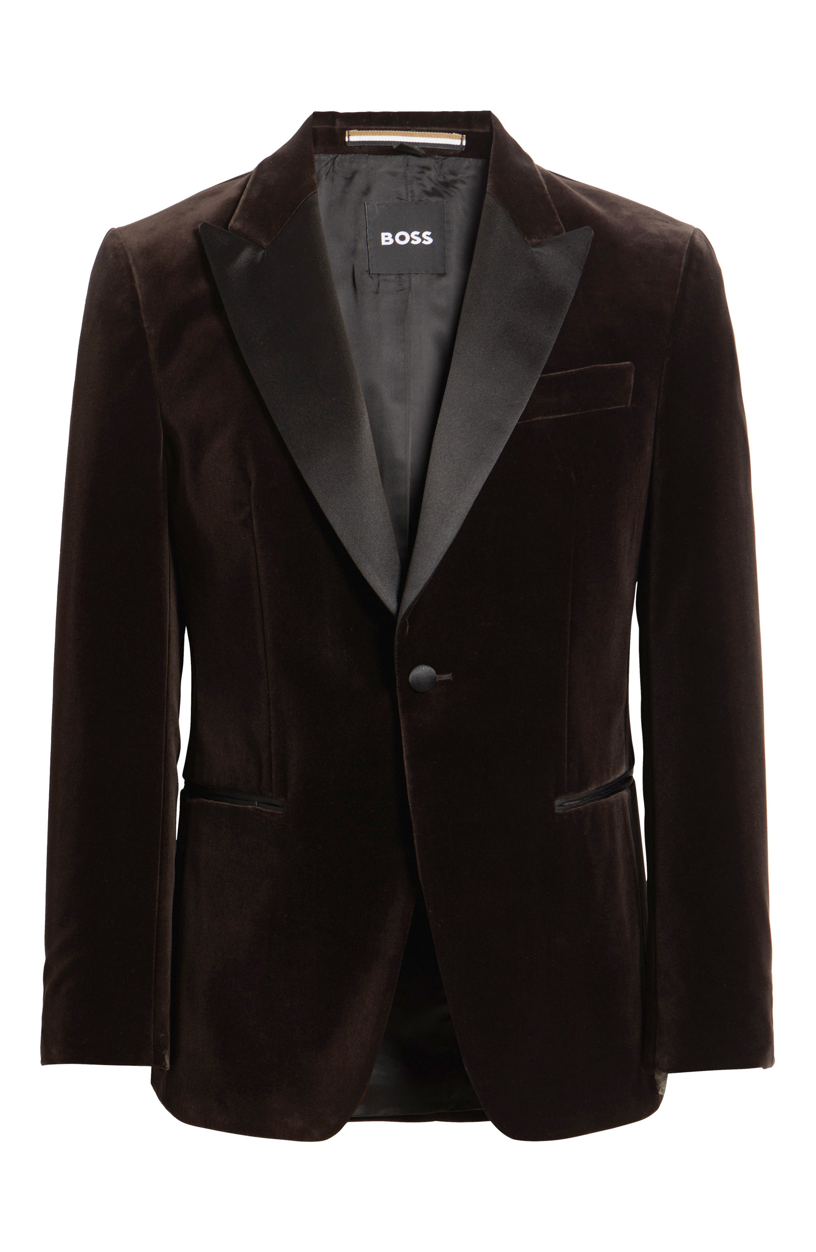 Dark cotton velvet brings luxe texture and subtle shimmer to a dinner jacket finished with black satin on the lapels and matching covered buttons. Besom pockets and subtle contouring at the waist provide traditional detailing and a refined silhouette that complement any elegant event or occasion.Fabrication: Velvet is a plush weave used mostly for sport coats and dinner jackets, and it provides softness and a distinctive shimmer that elevates any semiformal or formal look. More festive than traditionally formal, it’s ideal for special occasions and cooler-weather events.Formality: Elevated-formal and special occasions that invite you to have a distinctive look and a polished elegance. One-button closure Peaked lapels Nonfunctional four-button cuffs Chest welt pocket; front besom pockets; interior button-tab welt pocket Side vents Lined 100% cotton Spot clean or dry clean Imported
