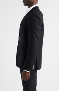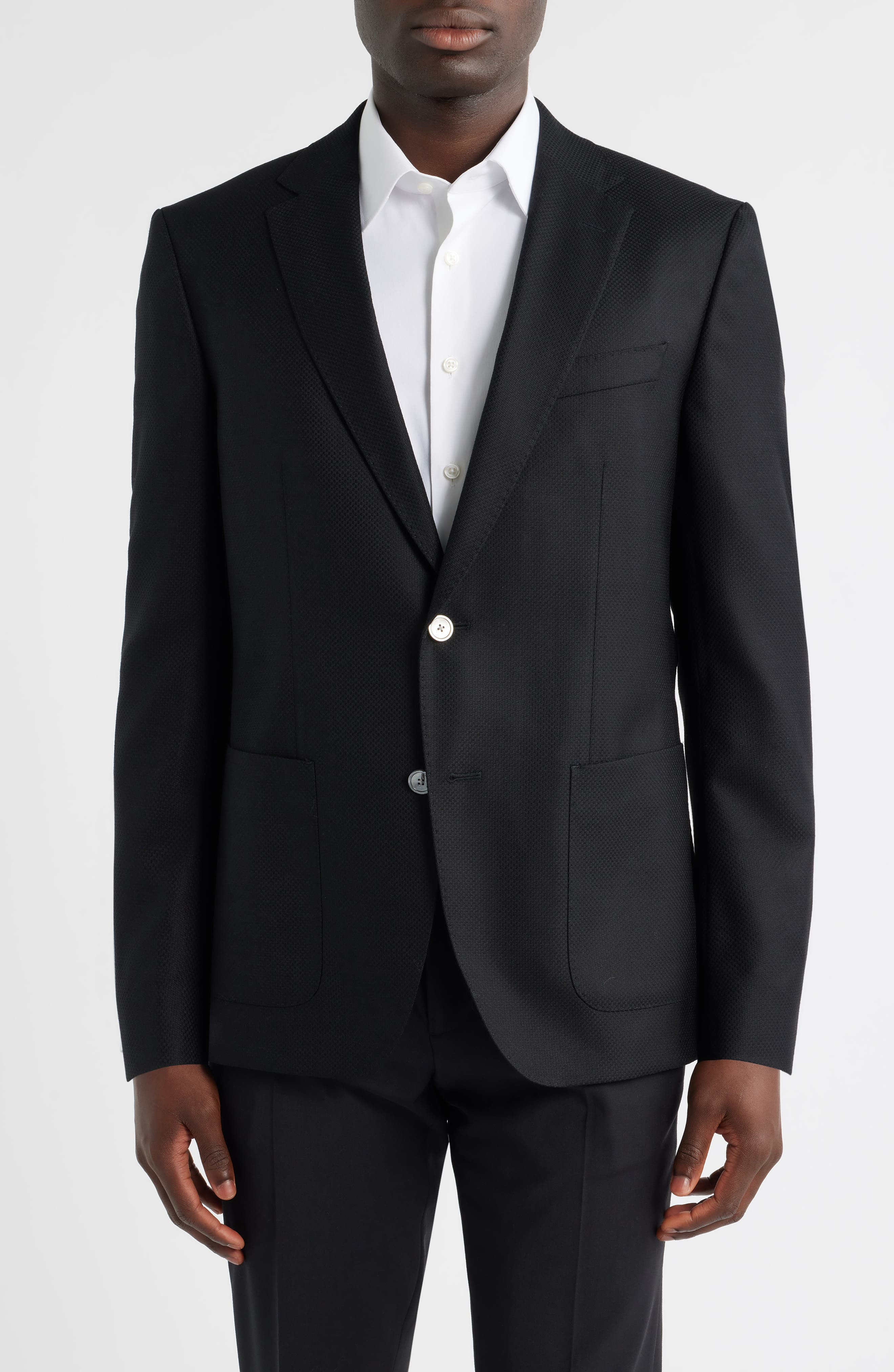 Textured black wool relaxes the formality of a sport coat that's tailored in a slim profile with smartly padded shoulders and a fitted waist providing a classic silhouette. Traditional detailing and a partial lining make it a comfortable choice for semiformal and between-season occasions.Fabrication: Wool is the most common of suiting fibers, with durable, flexible properties that help formalwear maintain its shape. Naturally breathable and water-resistant, wool retains heat when it's cold and vents heat when it's warm.Formality: Semiformal occasions that require you to look on the casual side of well-dressed, including daytime events, business-casual meetings, work travel and social functions Notched lapels Nonfunctional four-button cuffs Chest welt pocket; front patch pockets Side vents Partially lined, with taped seams 100% virgin wool Dry clean Made in Turkey