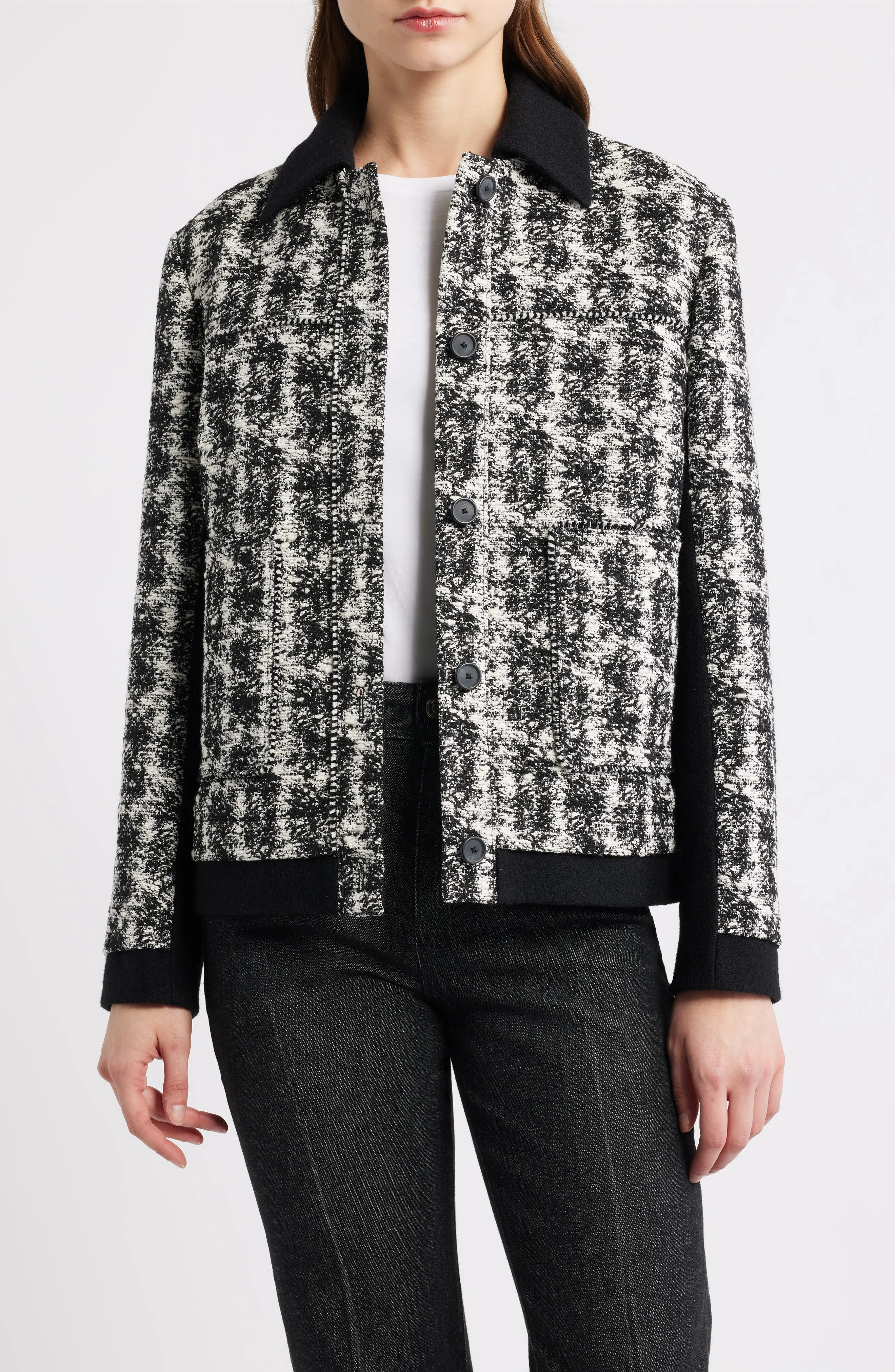 A two-tone design enlivens this full-of-polish tweed jacket cut in a boxy fit and trimmed with solid accents. Front button closure Spread collar Front patch pockets Lined 34% polyester, 29% cotton, 23% acrylic, 10% wool, 4% other fibers Dry clean Imported