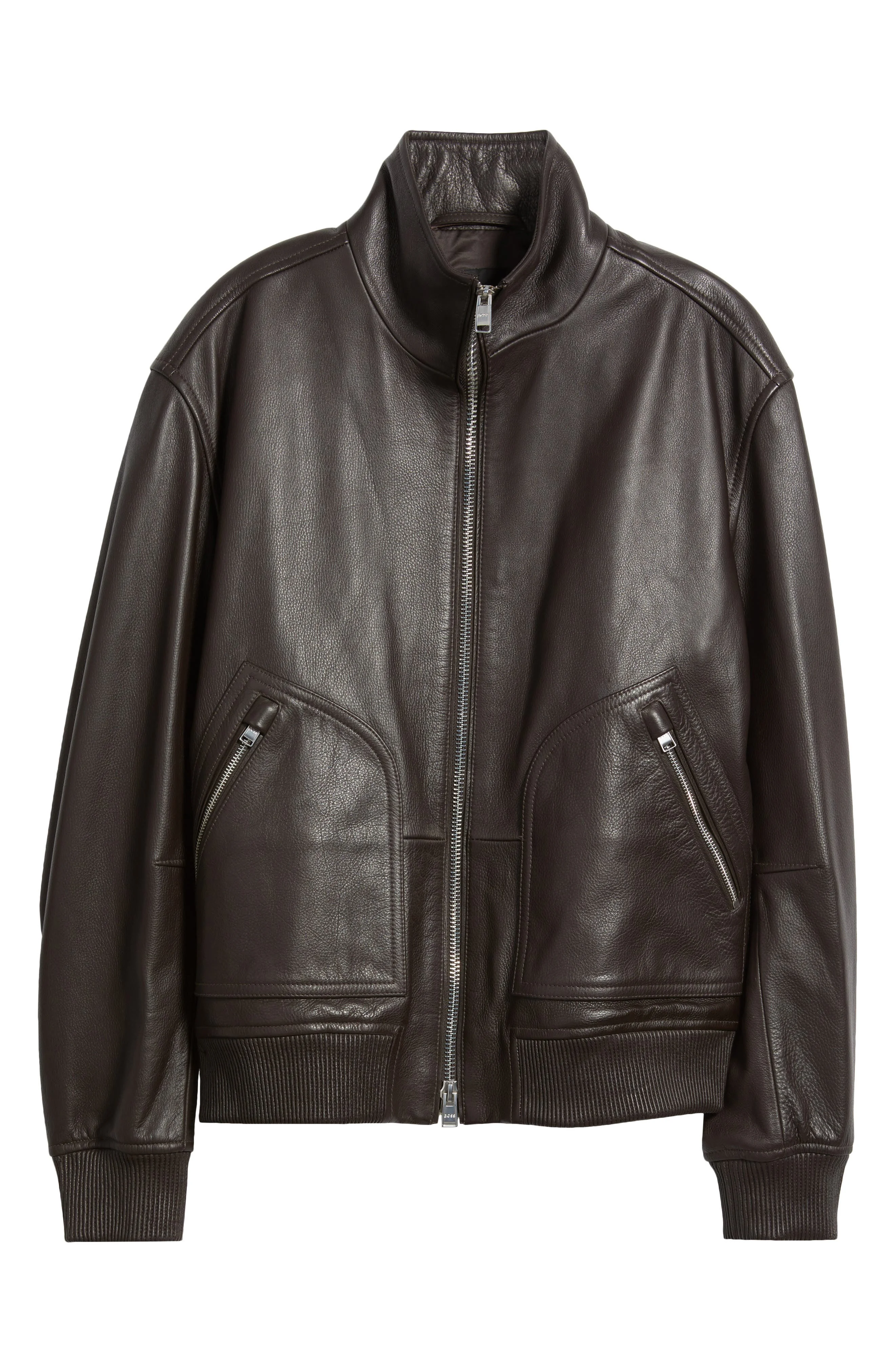 Go classic in this bomber jacket made from smooth leather for a look and fit that will complement you for years to come. 25 1/2" length Two-way front-zip closure Stand collar Ribbed cuffs and hem Front zip pockets Leather Imported