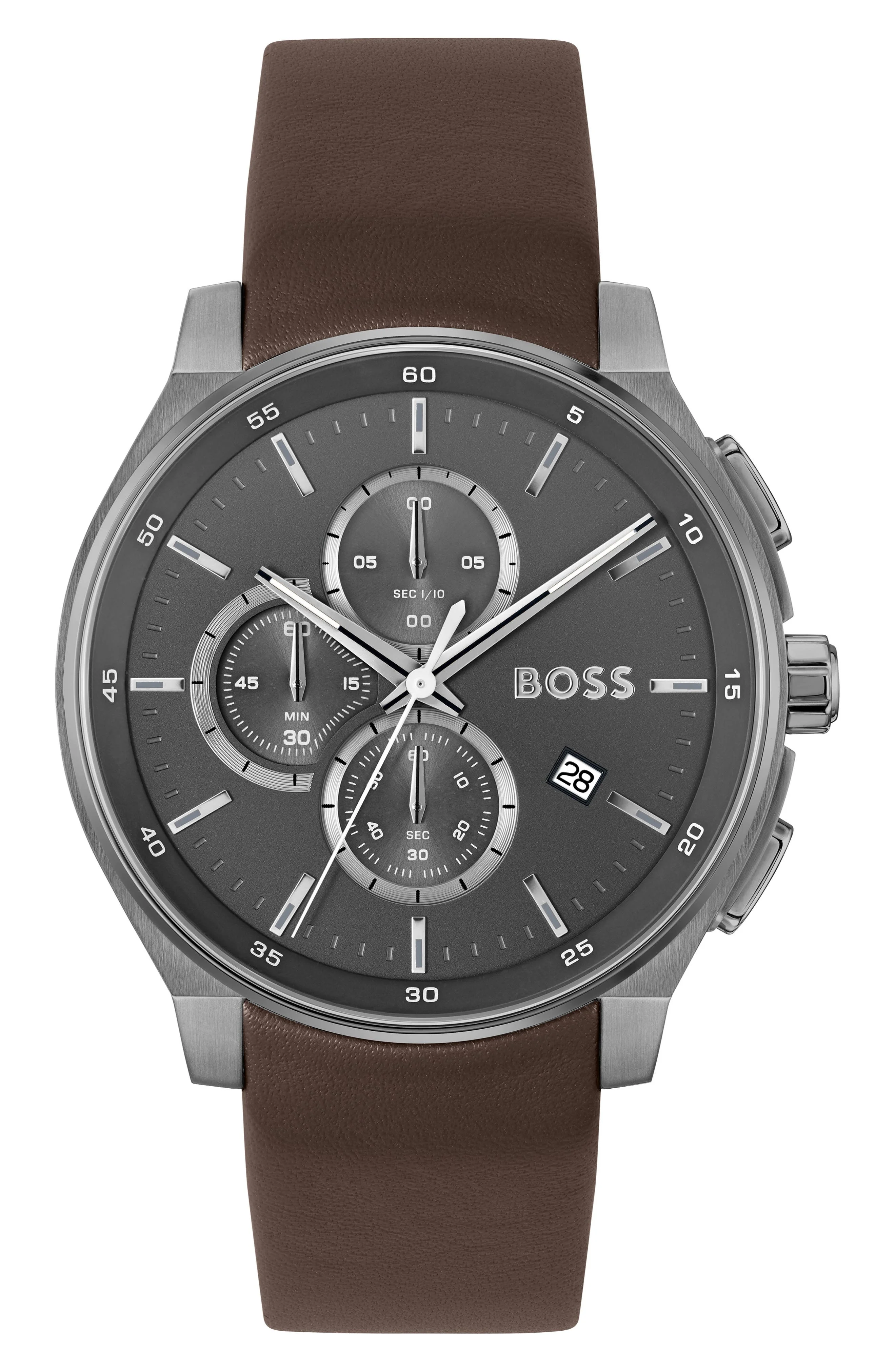 GRAY-PLATED CHRONOGRAPH WATCH WITH LEATHER STRAP