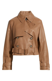 A matching belt completes the monochrome look of this structured leather jacket in an abbreviated length. Double-breasted button closure Notched collar Belted cuffs Gun flap Storm flap Removable belt Partially lined Leather Professional leather clean Imported