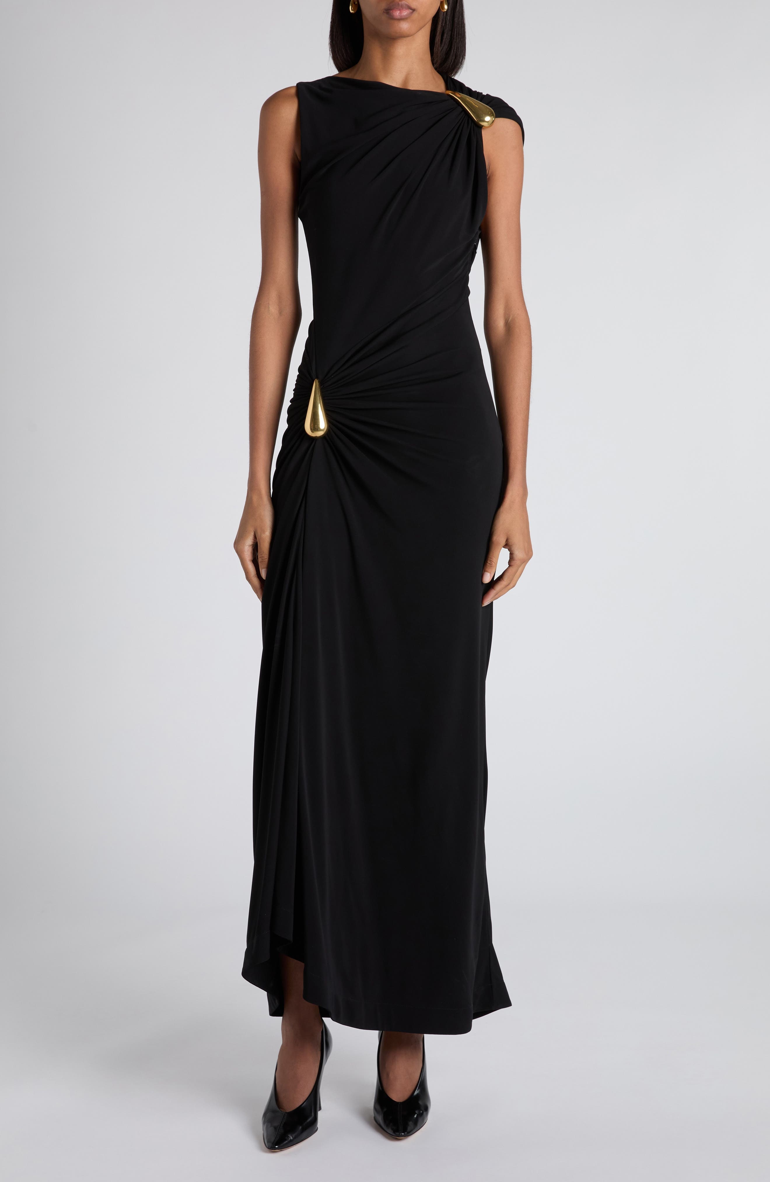 Matte jersey gracefully drapes your shape in this slim-cut dress preaccesorized with sculptural brooches modeled after Bottega Veneta's cult-favorite drop earrings. Hidden side-zip closure Asymmetric neck Sleeveless Lined 100% viscose Dry clean Made in Italy Designer Clothing