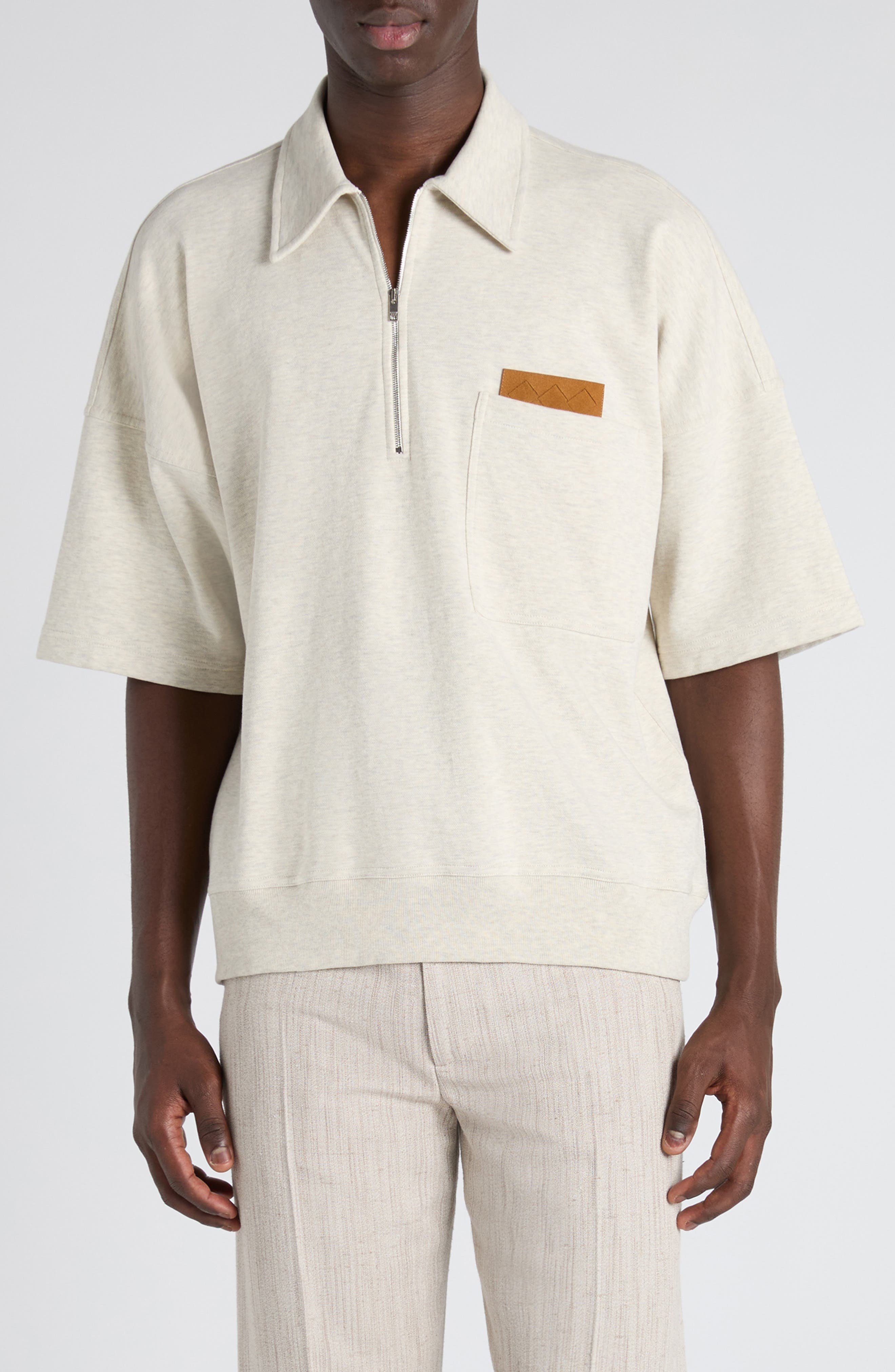 Bottega Veneta Double Cotton Mélange Jersey Quarter Zip Polo with Intrecciato Suede Patch in 9781 Se
