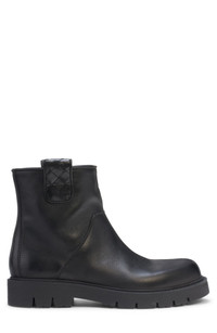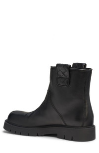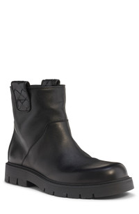A rugged lug-sole boot made from smooth calfskin leather manages to work in the label's signature intrecciato weave at the pull tabs on the cuff. Pull-on style Leather upper and lining/synthetic sole Made in Italy Designer Shoes