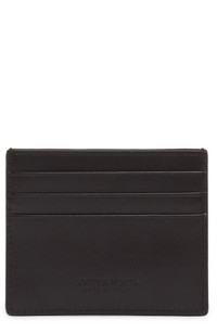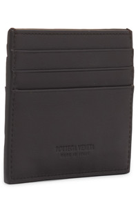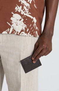 A mixed-scale version of the brand's iconic intrecciato weave—crafted from handwoven grained and smooth strips of soft calfskin leather—textures this supple card case. 4"W x 3"H x 1/8"D Center slip pocket; three card slots Leather Made in Italy Designer Handbags