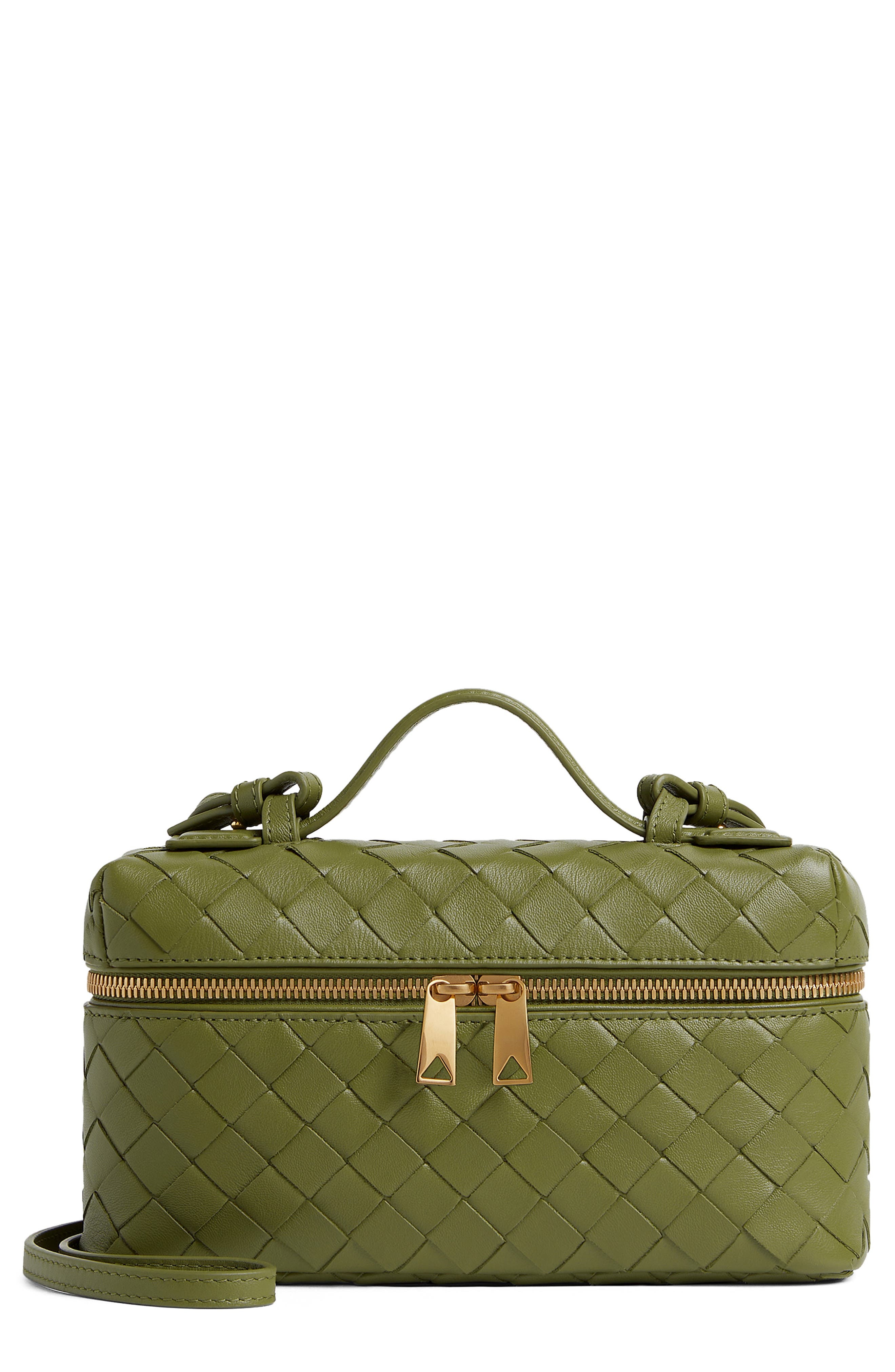 A removable crossbody strap takes this signature handwoven leather vanity case from travel to everyday essential. Two-way top-zip closure Top carry handle; removable, adjustable crossbody strap Structured silhouette with flat base for stability Unlined Leather Made in Italy Designer Handbags