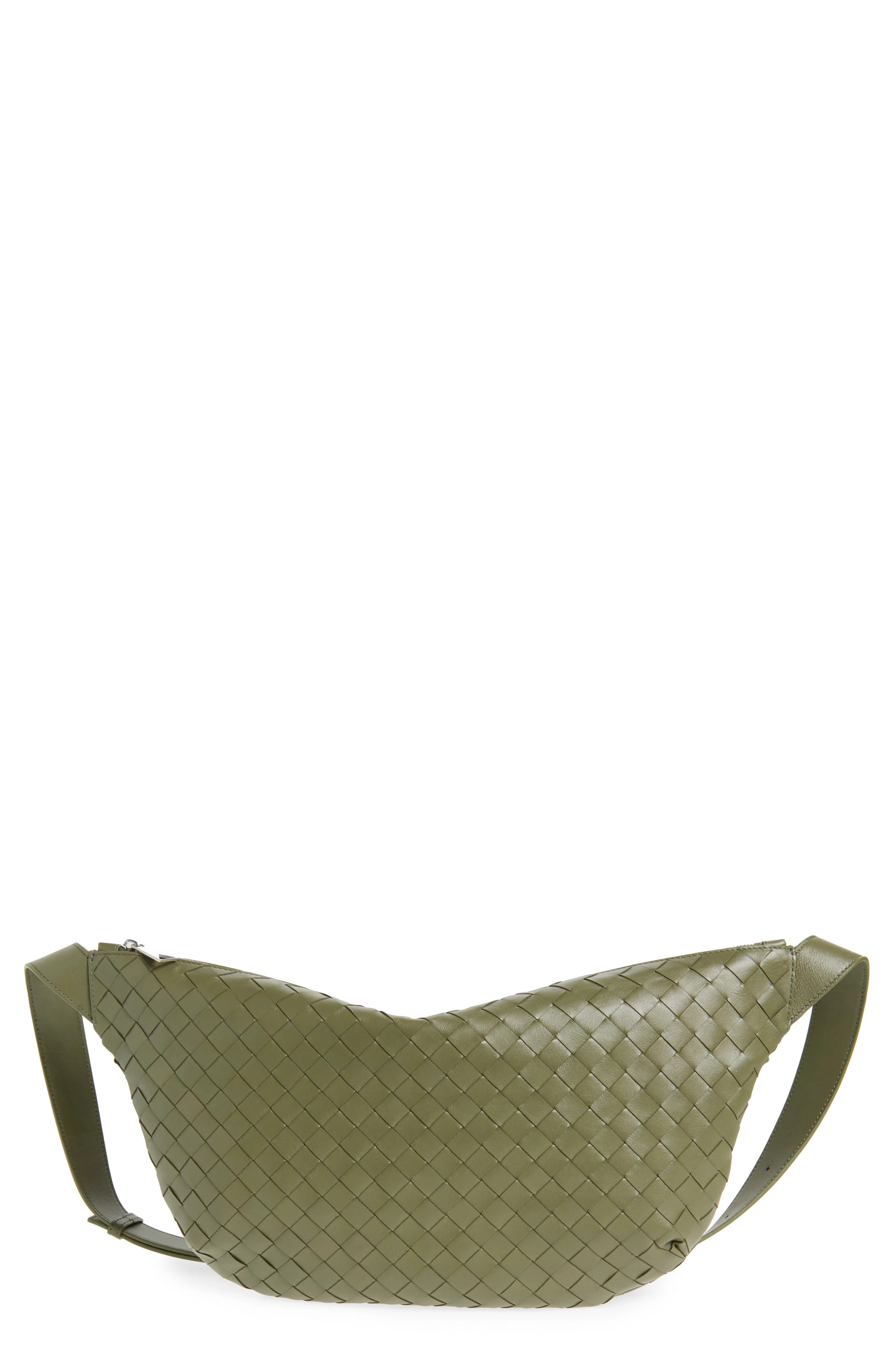 The label's intrecciato technique lends signature textures to this calfskin-leather bag crafted in a rounded silhouette with an integrated shoulder strap that easily adjusts for the perfect length. 10 1/2" x 18 1/2" x 2" 20 1/2" shoulder strap drop Top zip closure Adjustable crossbody strap Interior zip, wall and smartphone pockets Canvas lining Leather Made in Italy