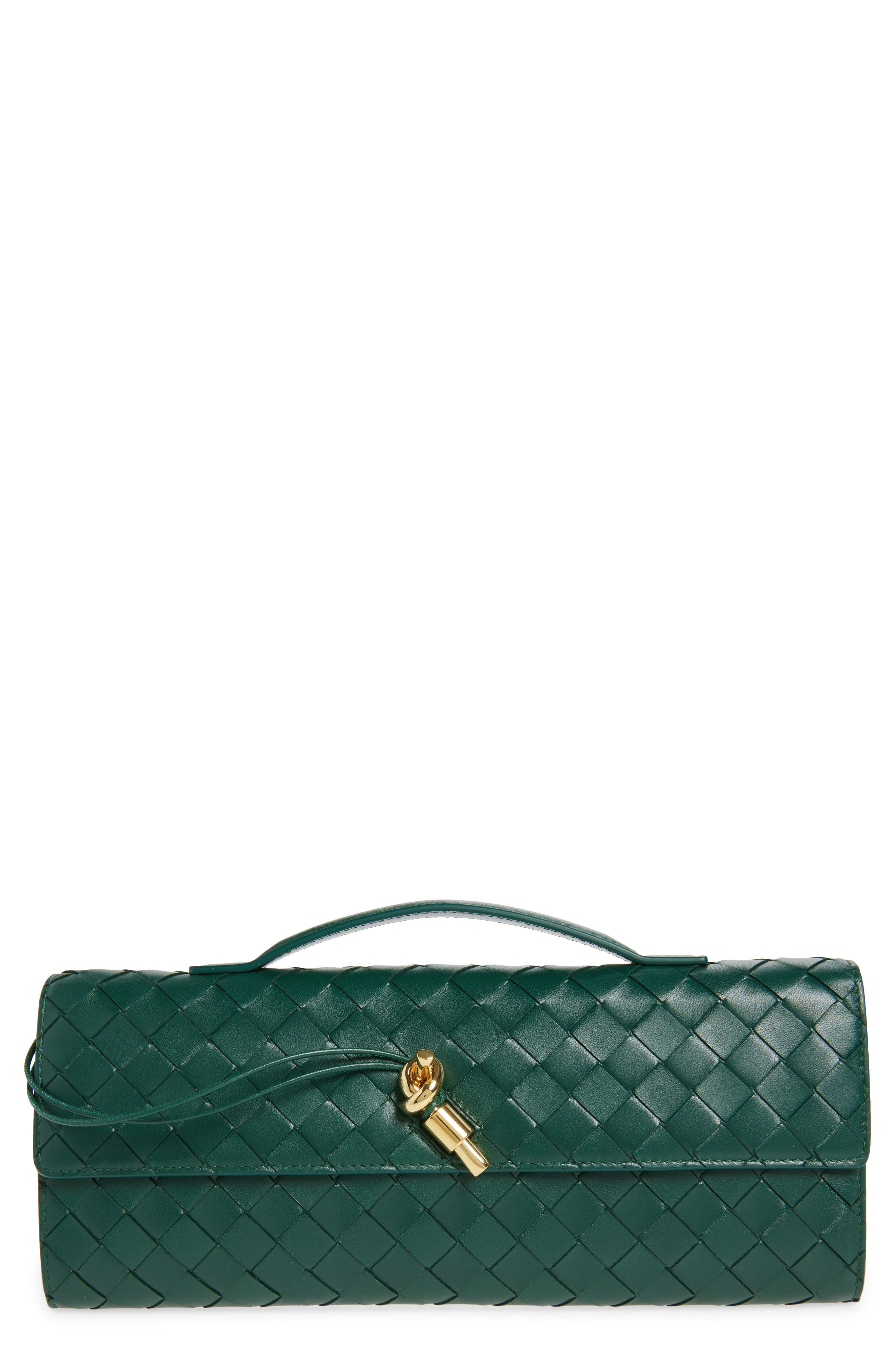 This long, sleek leather clutch in the label's signature intrecciato weave features a low-profile top-carry handle and metallic-knot hardware. Thread-through pin flap closure Top carry handle Wall pocket; six card slots Leather Made in Italy Designer Handbags