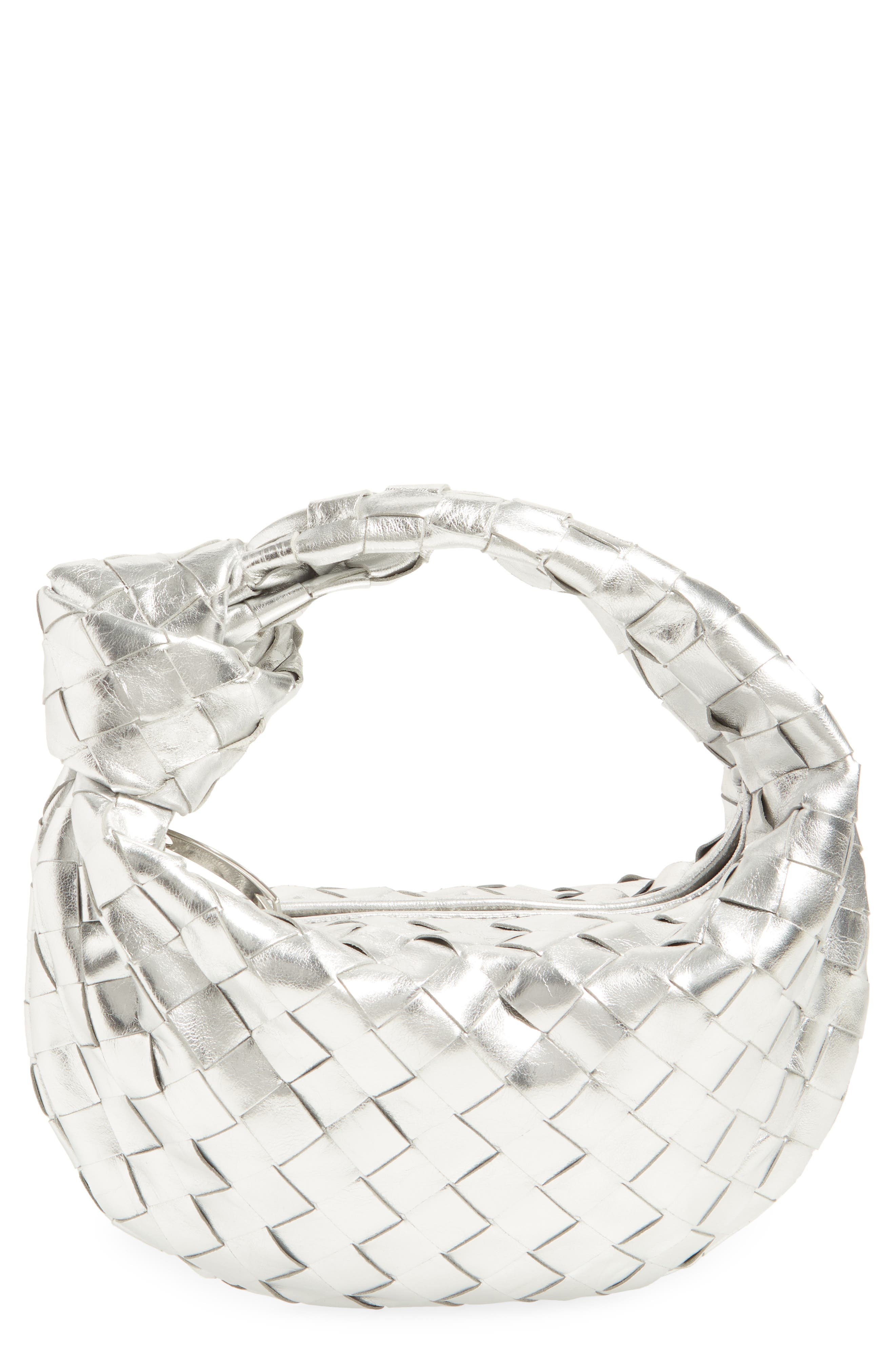 The brand's iconic Intrecciato weave, crafted from handwoven strips of metallic calfskin, textures this standout hobo bag softly structured in a compact silhouette. A knotted top handle adds to the pillowy dimension. Top zip closure Top carry handle Leather Made in Italy Designer Handbags