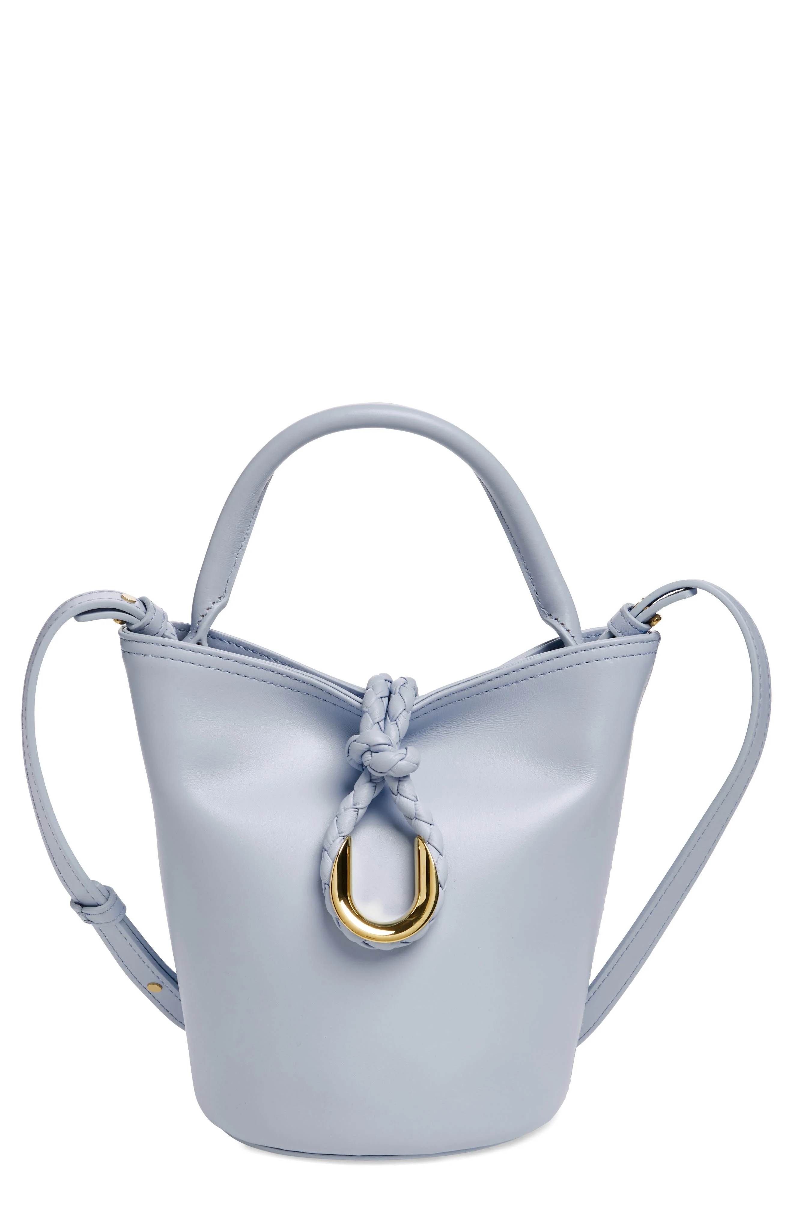 A braided cord slips over golden crescent hardware to secure this fun-sized bucket bag crafted from supple Italian calfskin. Slip-over cord closure Top carry handle; removable, adjustable shoulder strap Structured silhouette with flat base for stability Suede lining Leather Made in Italy Designer Handbags