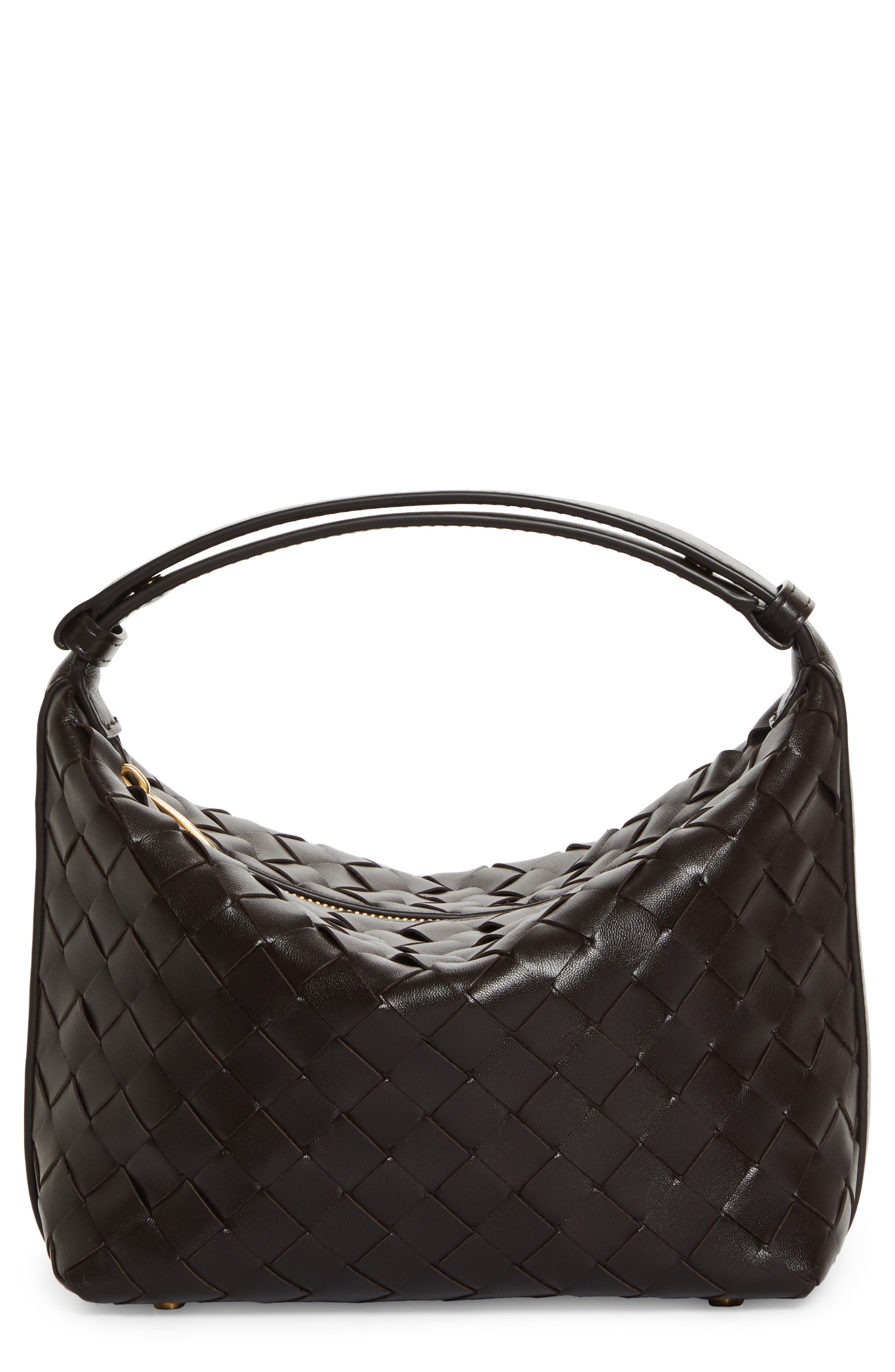 The Italian label's iconic intrecciato weave brings rich texture to this compact bag wrapped with a leather strap that adjusts for hand-held or shoulder carry. Top zip closure Adjustable shoulder strap Protective metal feet Leather lining Leather Made in Italy Designer Handbags