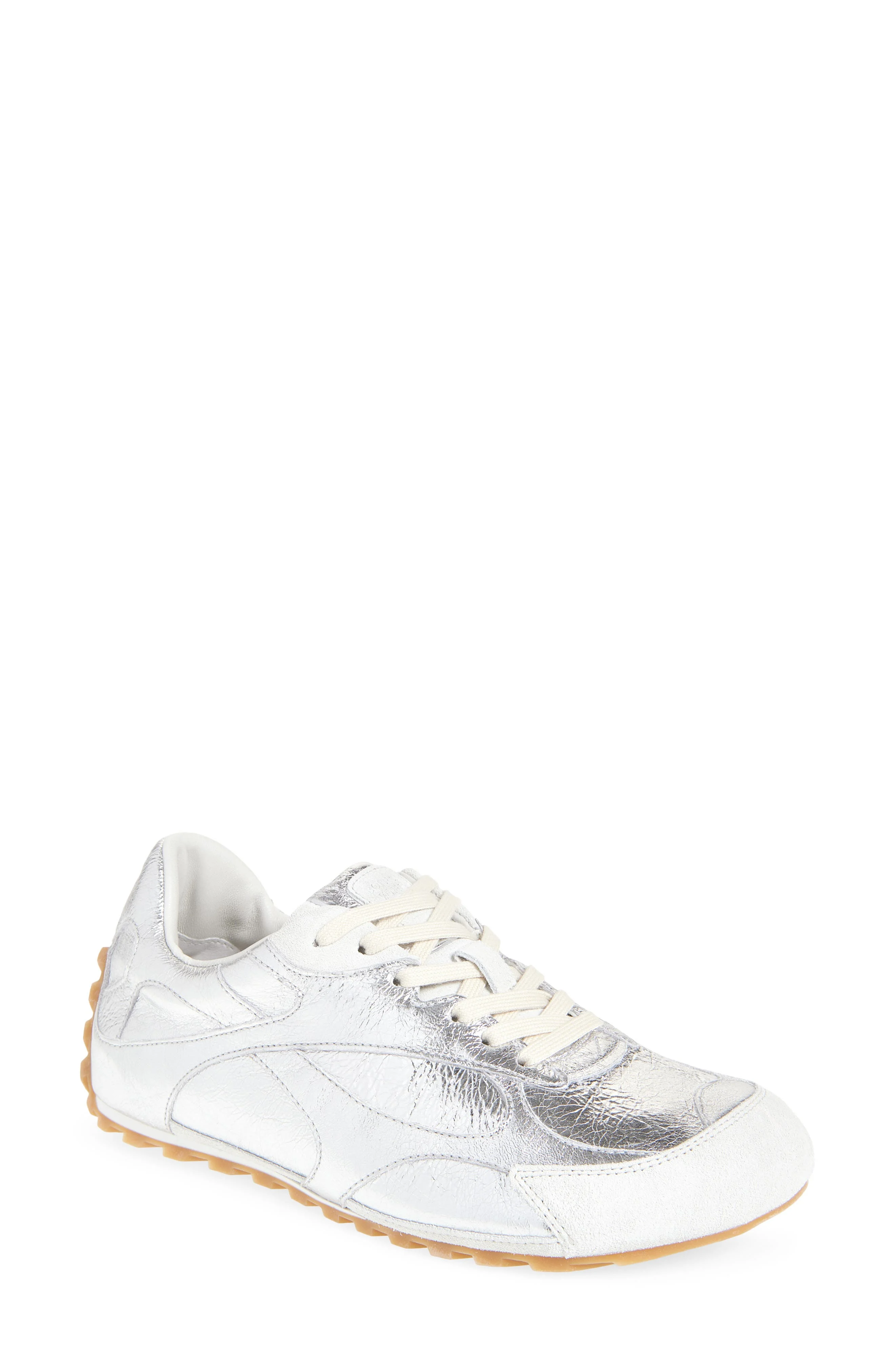 Swooping overlays detail the metallic-calfskin upper of this retro sneaker set on a low-profile sole with overlapping chevron tread. Lace-up style Removable insole Leather and lining/rubber sole Made in Italy Designer Shoes